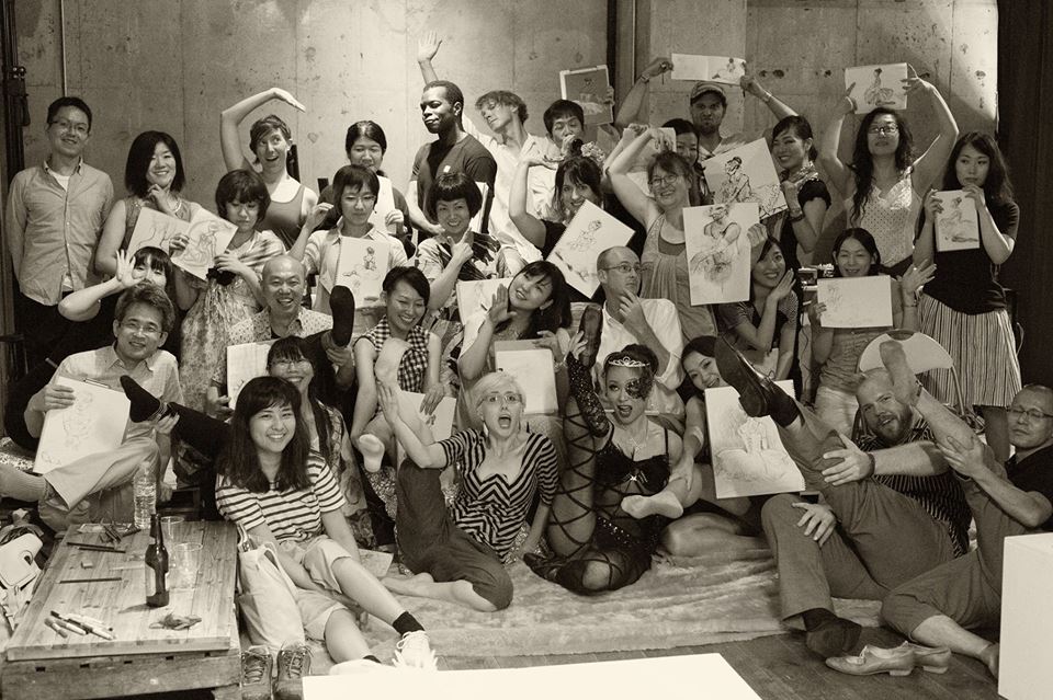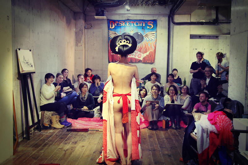 Our normal monthly event costs ¥2,000 and includes one drink at the bar. It’s cheaper than most life drawing sessions in Tokyo and the proceeds go to our extraordinary models, who are artists themselves. We’re proud to support these performers and we’re lucky to have such a cozy space in the heart of Harajuku and an awesome DJ to help our party along!