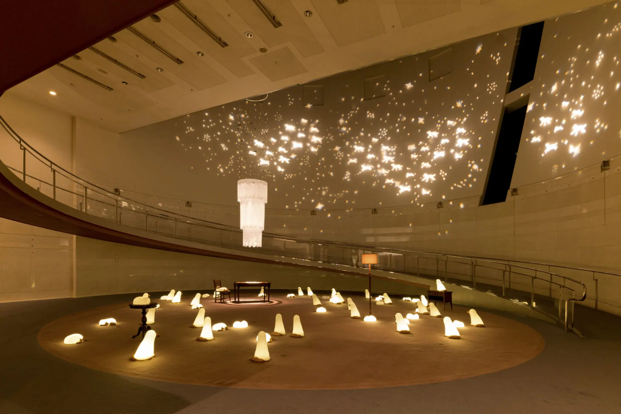 Foxco’s endeavor to weave emotions of loss and darkness into a narrative of hope and warmth brought the stunning installation to life. Centered around a tiered lantern, the circular space consists of several elements that come together as an ethereal, immersive piece. The lantern, fashioned with small cutouts, creates a revolving projection of dogs frolicking across the night sky, represented by Spiral’s domed ceiling. Beneath, a crowd of glowing Ghost Dogs — some slumbering, some gazing — encircle a wooden desk with sketches, mirroring foxco’s studio.