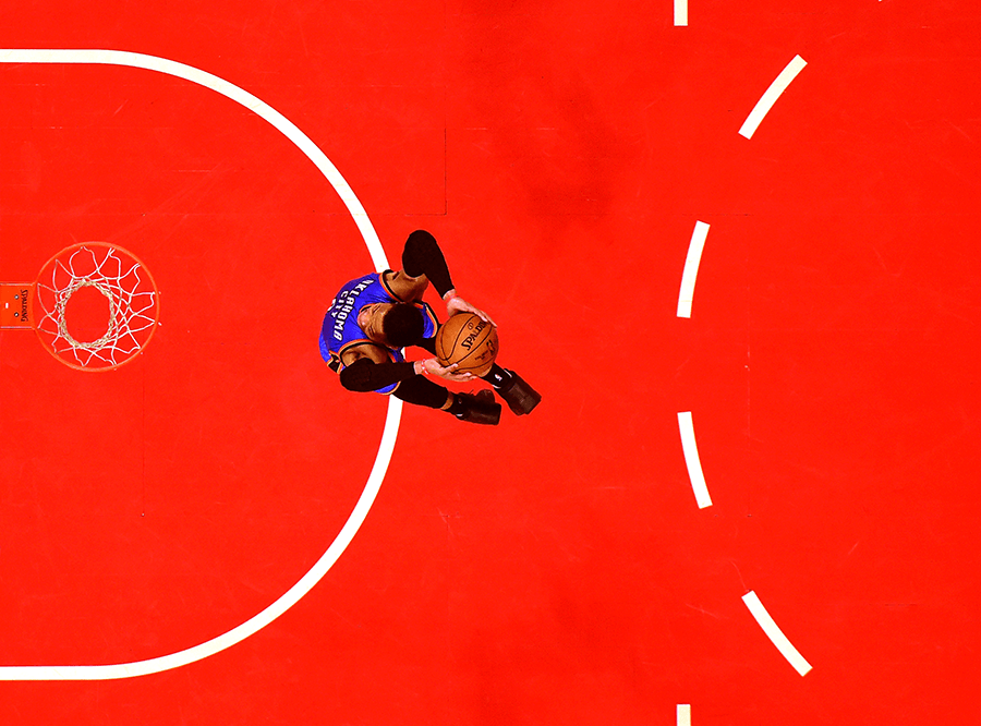 Russell Westbrook of the Oklahoma Thunder dunks after a steal against the Los Angeles Clippers at Staples Center in Los Angeles on January 16 (Harry How/Getty Images)
