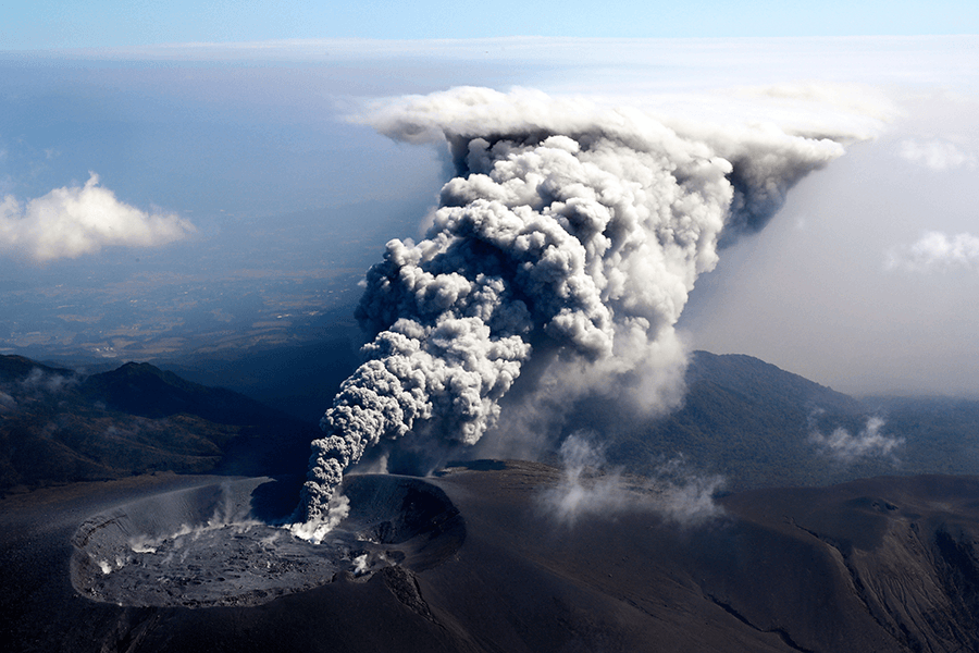 Volcanic ash spews from the crater of Mt. Shinmoedake on October 11 in Kagoshima Prefecture, Japan (The Asahi Shimbun via Getty Images)