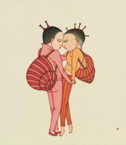 Shieh’s human figures are already effortlessly androgynous. But in the images at the “Linear” show, Shieh’s linear drawings seem to be more about blurring lines, especially those of gender. Perhaps the most telling of these works is Snails. In this painting, a kissing couple have similar non-gendered haircuts and are dressed almost identically. Is one shorter than the other, or is it simply the way they are standing? Are both women? Both men? It is impossible to be sure. On their backs, they wear backpacks that have transformed into snail shells: the perfect image of genderless love.