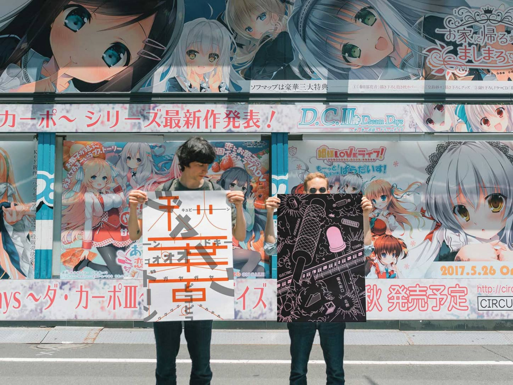 While their Ikebukuro Station exhibition led to a night of bowling, the duo have found nice surprises at lesser-known destinations. They contacted a local family-run theatre ahead of their July exhibition near Tabata Station and seized the opportunity to set up a small crew to film a mini-documentary about the poster production process. The documentary then aired during the exhibition.