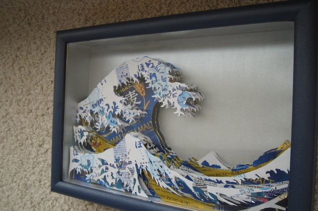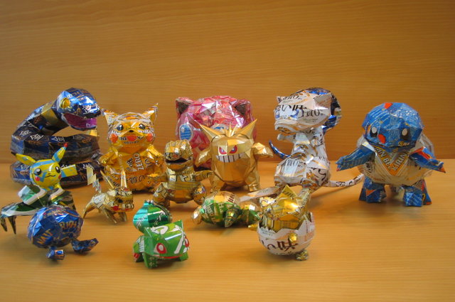 The Japanese artist Makaon uses colorful cans to create sculptures and framed 3D images with a pop culture twist. He explains on his website that he downloads and prints paper craft templates, which he then sticks onto empty aluminum cans, finally cutting them into the right shapes and building them according to the template instructions.