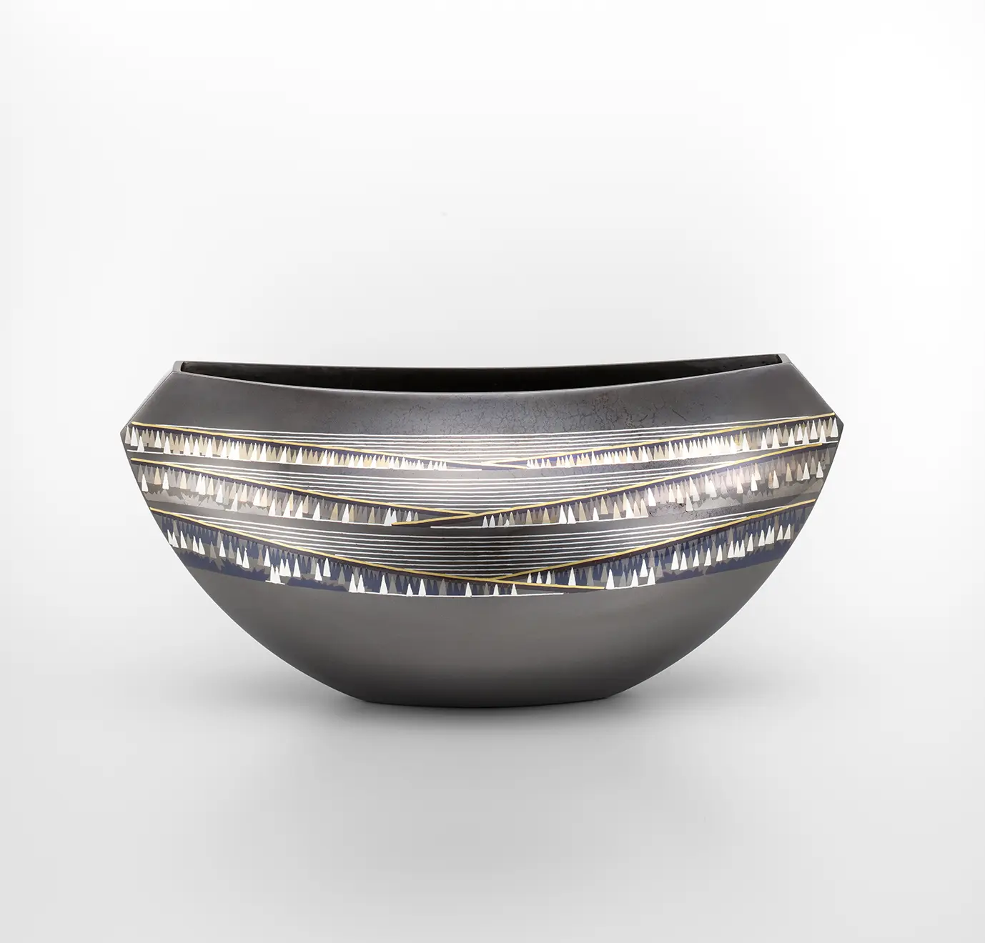 While Kaga zogan follows the basic process of metal inlay that flourished in Anatolia some 5,000 years ago, the technique was refined in Japan, with a focus on employing alloys for greater color variety. Nakagawa favors a hazily silver-toned blend of copper and silver, known as oborogin, for his base pieces inspired by forms from everyday life. His advanced skills allow him to practice the complex art of multilayered kasane zogan, which requires extreme precision and an intricate understanding of metallic reactions.