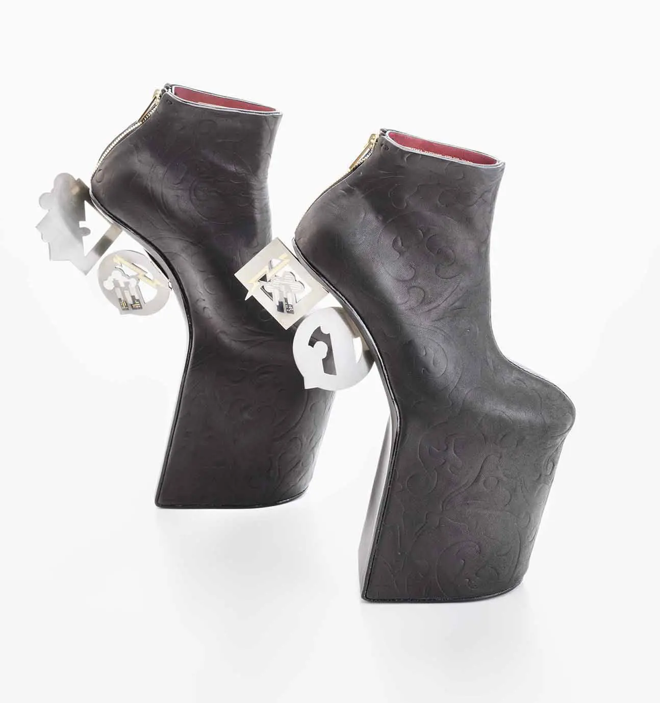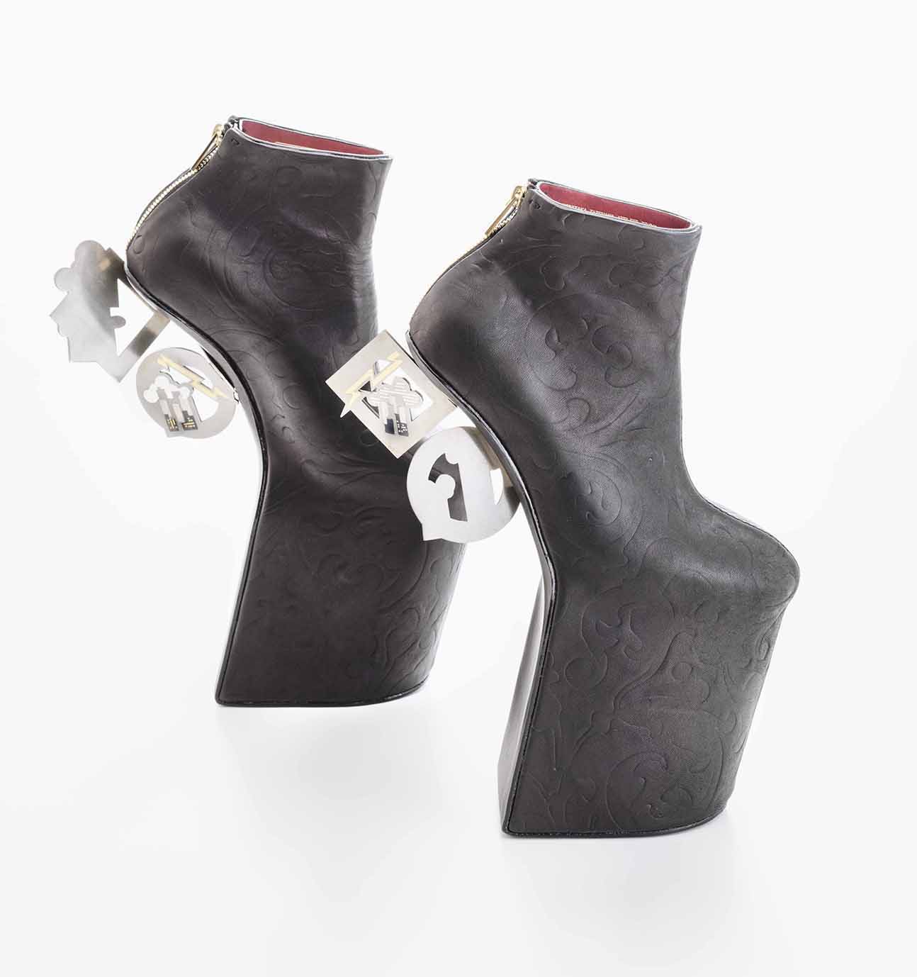 With this in mind, he is actively nurturing the next generation of artisans and spreading knowledge of Kaga metal inlay through global travel, teaching and research. The Panasonic show presents recent applications of metalcraft in fields such as jewelry and architecture, along with works by artists following in Nakagawa’s footsteps. His collaborators include Noritaka Tatehana, best known for the Heel-less Shoes worn by Lady Gaga. Together they produced two new pairs for the exhibition, with Nakagawa supplying spur-like pieces attached to Tatehana’s embossed leather uppers. Tatehana observes: “It is rare for a living national treasure to be willing to collaborate with young artists, but traditional crafts will fall into disuse if they are merely regarded as cultural assets to be preserved. Mr. Nakagawa’s gaze is always fixed on the future, while also reflecting on the past.”