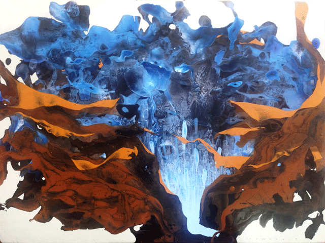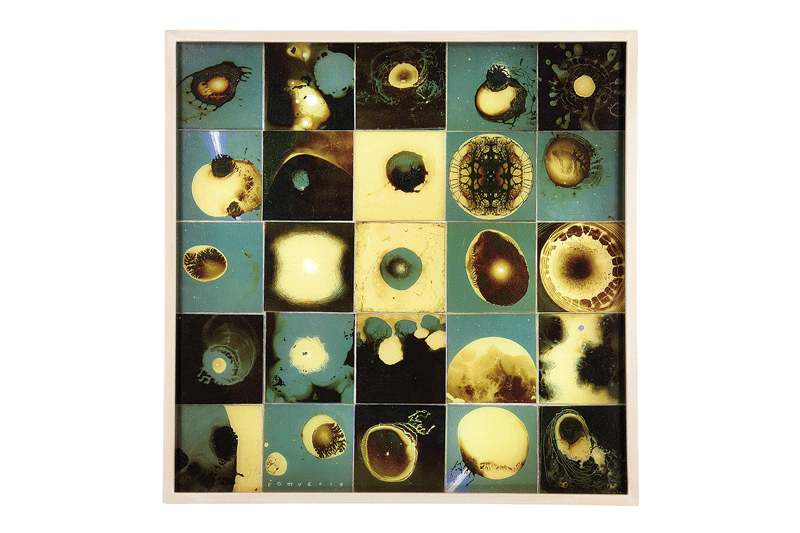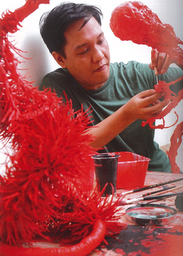 Not one to stay stuck in the past, he is quick to remind me that these early influences were just steps along the way: now the primary source of his inspiration are his surroundings. “Now, my inspiration comes from the natural world. I take note of how certain things in our cosmos work, then I twist it a bit to create something new. It is an endless resource.” Although Villaseran is primarily a painter and draughtsman, the University of the Philippines–trained artist also has interests in architecture, sculpture, and interior design, and a series of new pieces reveals a keen sense of observation. His three-dimensional “lightboxes,” featuring photographs and film painted with acrylic and lit from behind, depict forms that remind the viewer of some of the universe’s largest and smallest forms: exploding stars and dividing cells.