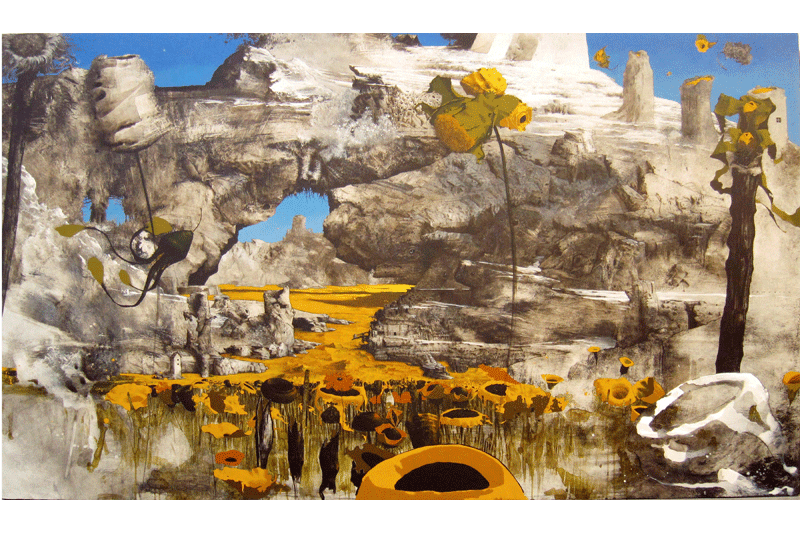 The artist has been making a name for himself with massive canvases painted in acrylic, and smaller pencil drawings, filled with precise, hallucinatory detail. In his pieces, a giant seahorse might be found wafting its way through a rocky desert, shadowy figures can be seen lurking in abandoned structures, and the very rules of nature seem to be just recommendations rather than strict laws. His color palette ranges from muted earth tones to bold color contrasts and vibrantly saturated landscapes.