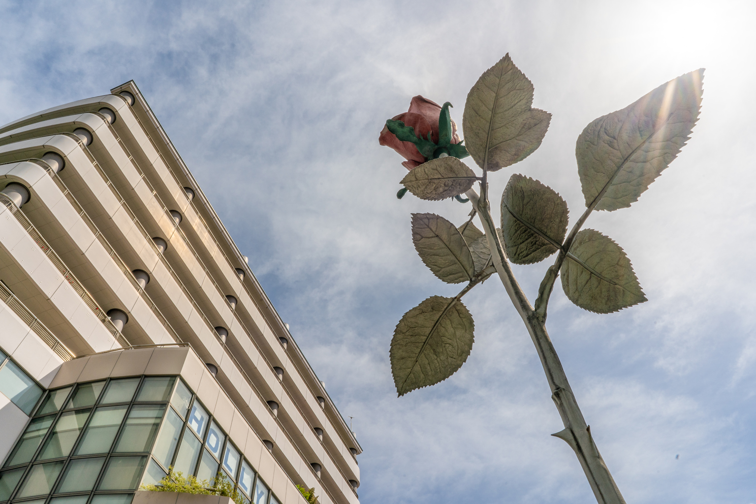 Isa Genzken’s “Rose” sculpture exudes a different kind of feeling. A disconcerting manipulation of size and space accompanies the beauty of the flower. The choice of such a delicate subject surrounded by reinforced concrete can also make us think about the often-overlooked transient beauty of flowers and the importance of injecting nature into city spaces.