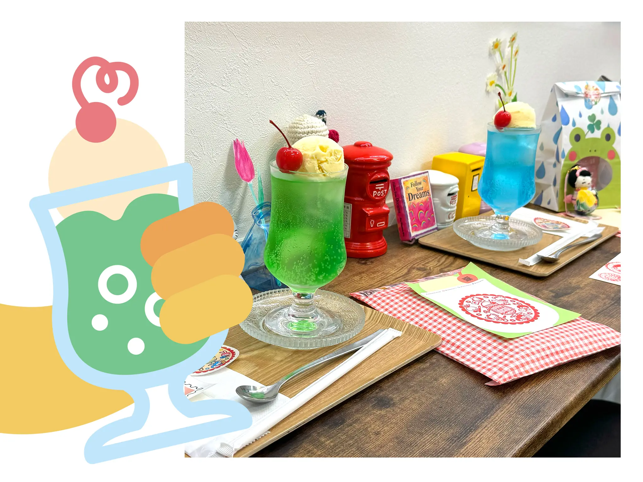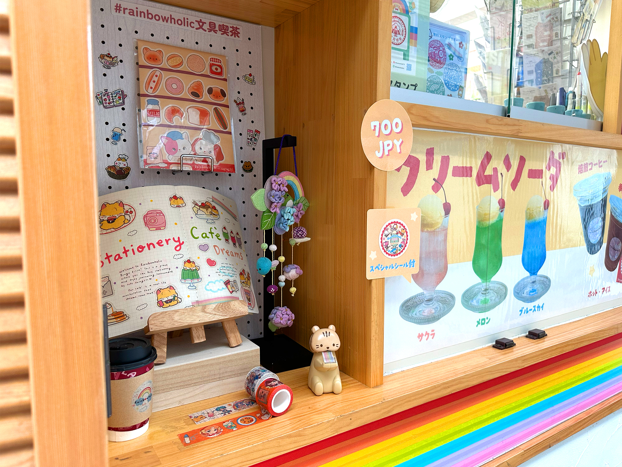 Walking the quiet length of Jujo Ginza Shotengai, you can’t help but be pulled in by the irresistible charms of Rainbowholic Stationery Cafe. The shop’s smiling tricolor mascot, Rainbow-chan, greets you at the door with a wave, and the open window houses a small display of trinkets, like a miniature shrine dedicated to journaling inspiration. The entrance has a warm, nostalgic vibe that carries into its comforting interior, while the welcoming storefront signboard beckons with its words: Kawaii bungu de asoberu kissaten — a cute cafe where you can play with stationery.
