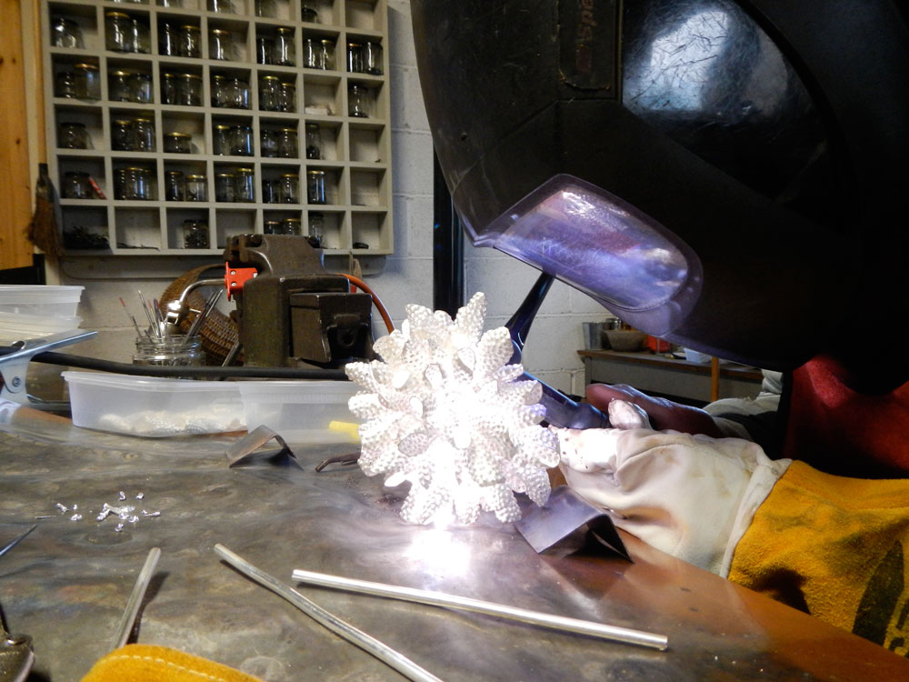 It was here that she developed her style of making her art by welding together tiny pieces of metal, but her philosophy behind her work goes much farther back. She says that when she was a child she was fascinated by tiny details and her favorite thing at school was a microscope. This desire to look deeply into the patterns of nature continued into university, where she came to an aesthetic realization that linked the microscopic and macroscopic worlds: “When I was researching some visual images in university, I noticed that patterns on Mars and those in the human blood vein structure were very similar, and I got this infinite impression of ‘repeat-ness’ in nature.” She feels a deep spiritual sensation from the repetitive process of making something and describes how she found making many components and welding to be “very meditative.”