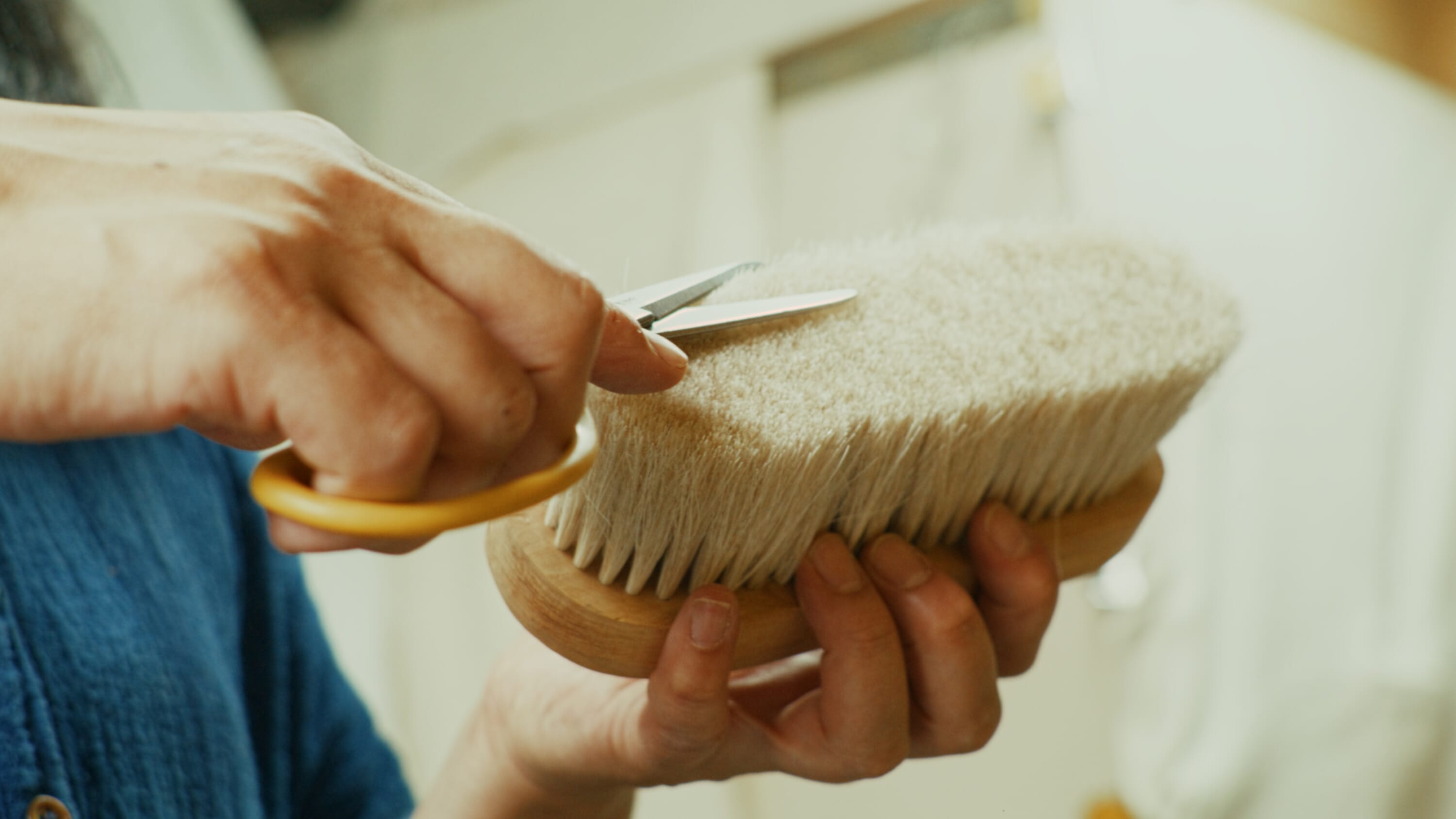 The hake brushes, which were made especially to produce the paintings, are displayed alongside the tools and materials with which they were made. “You very rarely get a window into the evolution of a product from its materials into the final work,” Tatehana explains. His decision to display the art works, alongside the tools from which they were made, helps to bridge this gap.