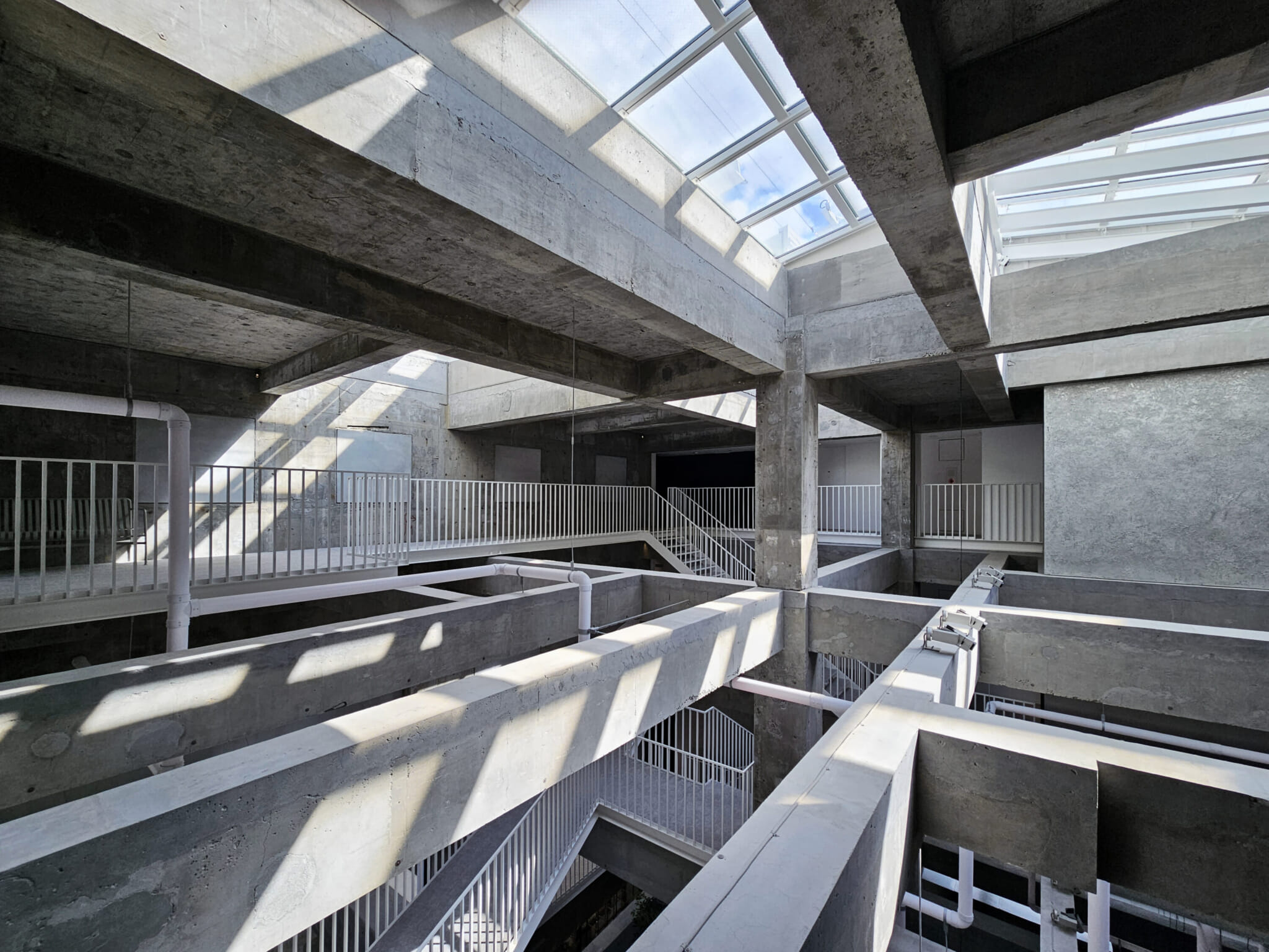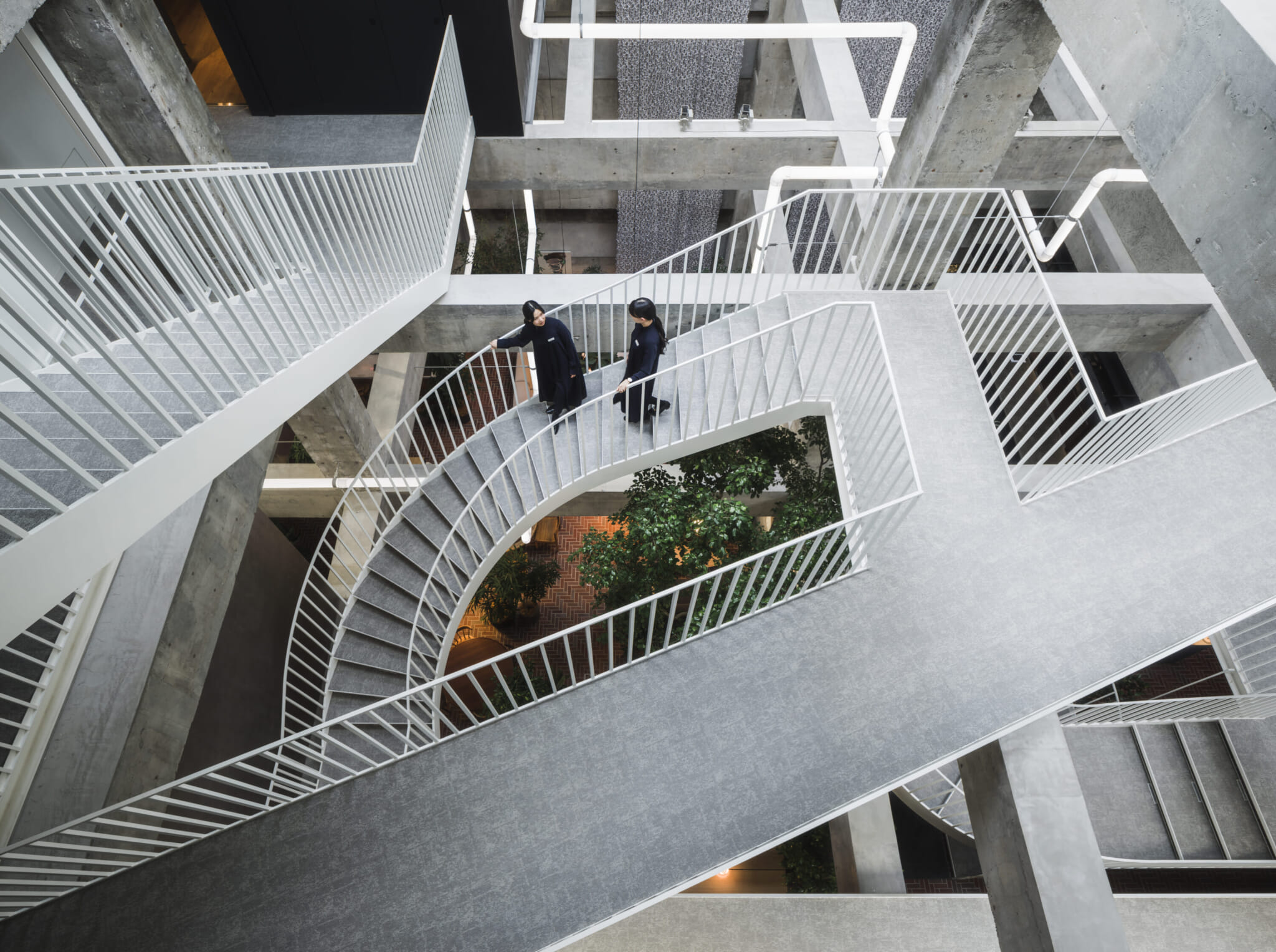 At first glance, the labyrinthine staircases and bridges that connect the floors above give the Heritage Tower an urban, modern feel, but every slab of concrete reveals workers’ markings from Shiroiya Ryokan’s renewal project in the 1970s.