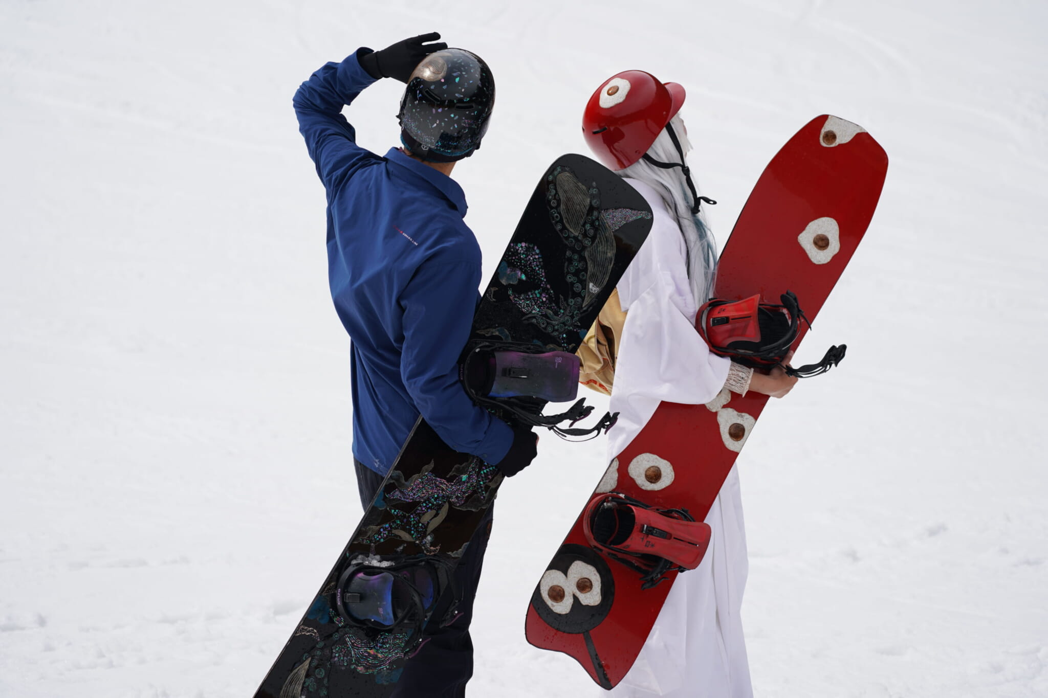 Furisode-clad runs aren’t the only way that Morino puts a unique spin on Japanese tradition: As part of her graduation thesis for art school, she creates one-of-a-kind artworks on the surface of snowboarding and ski equipment, decorating them with urushi lacquer. This traditional Japanese craft involves applying refined tree sap in multiple layers to create a durable, glossy finish; it’s typically seen on bowls, boxes and other household items.