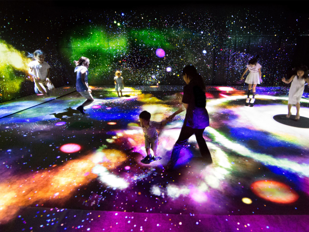 In practical terms, these concepts are brought to life in the Athletics Forest and Future Park areas of the museum. While adults will fully enjoy the activities on offer, it’s especially fun for kids to get involved. Here, you’ll absorb understanding about the ecosystem as you slide down a raised part of the floor and watch projections of honeybees pollinating flowers, which then turn to flowers and fruit. You’ll explore depth perception as you climb up and through a forest of lit-up poles. You can even ponder the life cycle of stars as you jump on a trampoline that “creates” new planets with each bounce.