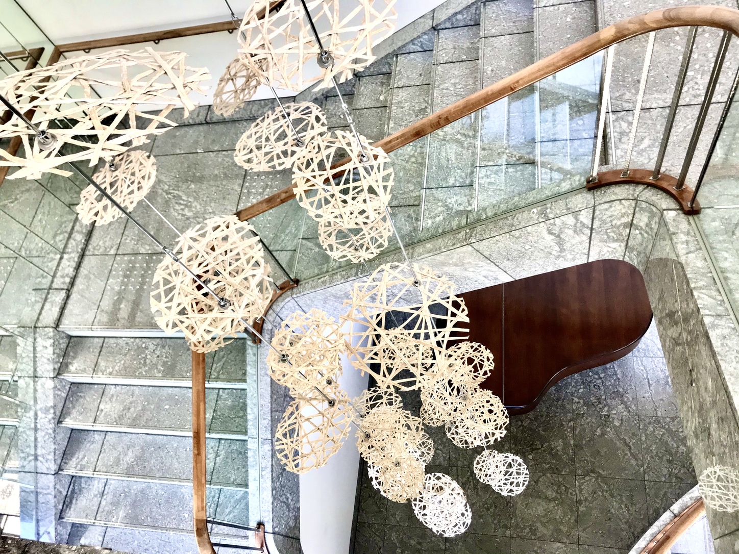 From the lobby and main reception area, some impressive highlights are Masahito Katayama’s bright yellow sunflowers, Himaku/Sunflower—2012, Mika Toba’s katazome stencil dyed Early Morning and Untitled — a pair of glowing green and red-orange abstract nature paintings by Huang Yuan Qing. As you ascend to the upper floors, charming woven balls hang from the ceiling.