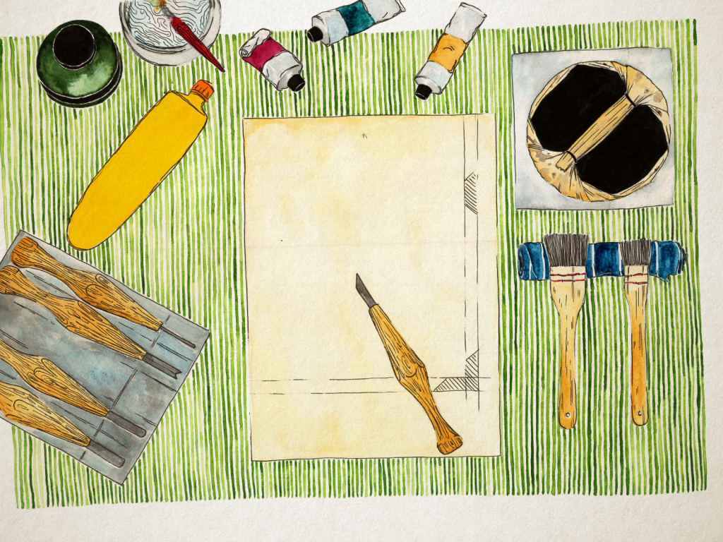 Allow me to introduce Tokyo-based artist Mia O. Her first taste of mokuhanga came in the form of a Japanese ukiyo-e art exhibit at the Brooklyn Museum. Inspired by the images on display, Mia looked into how they were made and was surprised to discover she wouldn’t need much to start practicing the technique herself. Most traditional printing methods ask for expensive and heavy equipment that the majority of people simply don’t have access to. Mokuhanga on the other hand uses just a small hand-held printing tool called a baren. This means mokuhanga artists can easily work from home or in multiple locations, as the printing tools are all small enough to be easily transported.