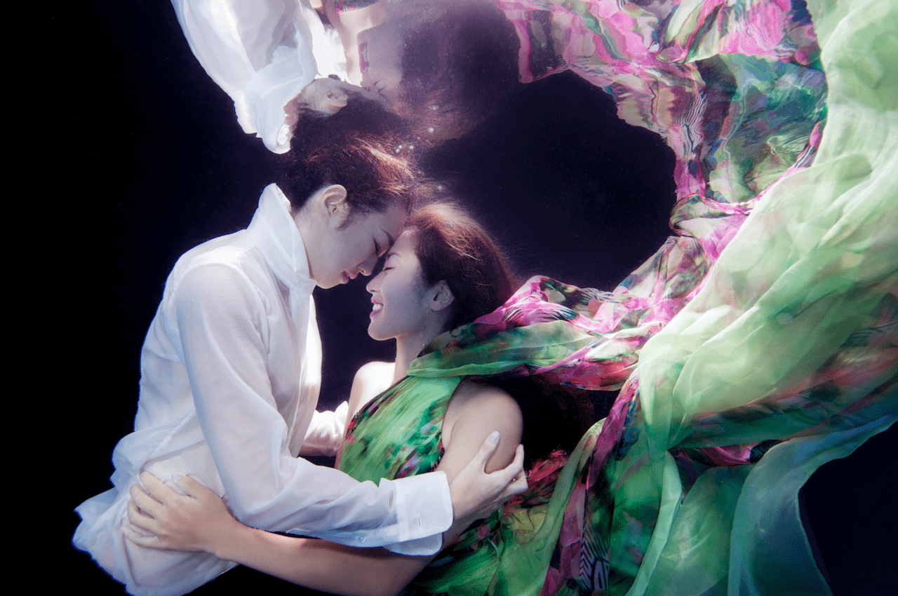 It depends on each customer – whether they want to use their own clothes or if there is a lot to arrange. We will consult with them by mail or phone. You can choose from our selection of outfits and props, and we can help you decide on colors and style, and discuss if there are parts you don’t want to show. Before entering the pool, you need to put on diving weights. We will help you to decide how to pose and what to be careful of in the water; for example, the hair will flow upwards so it’s more natural to pose with an arm raised up. After shooting, the customers can select the pictures they want and we will do a little bit of Photoshopping to fix any problems, and enhance them.