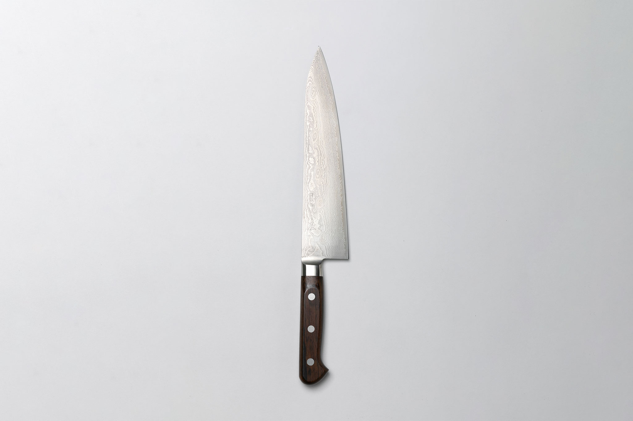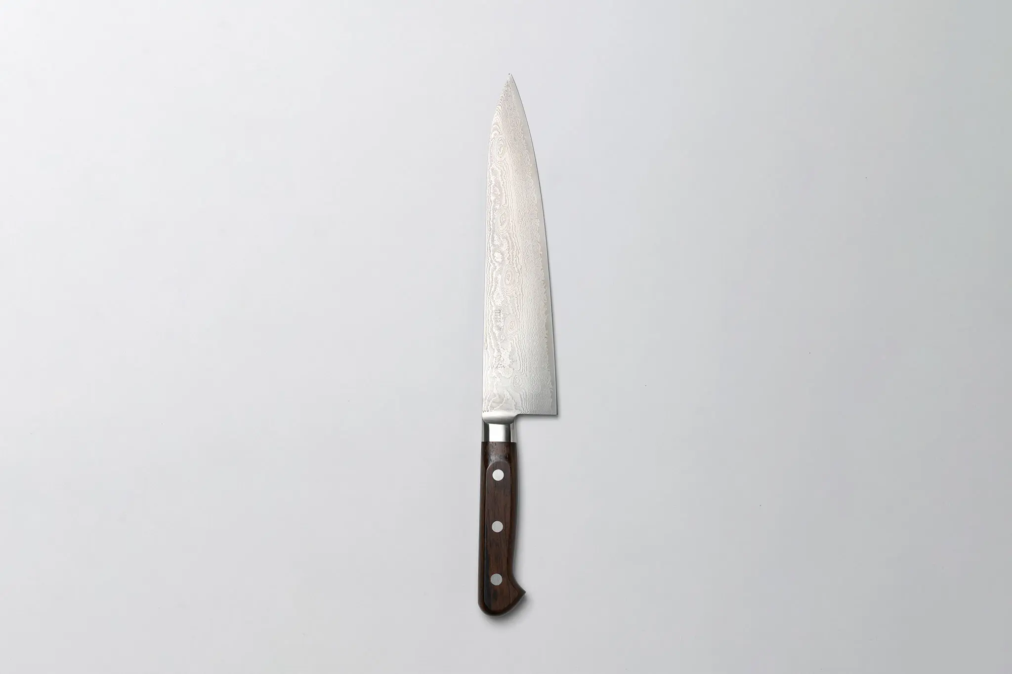 Made of Super Gold powder steel, these sleek and stylish knives have long-lasting sharpness and are resistant to rust. They are layered with nickel alloy and stainless steel to create a suminagashi (floating ink) pattern on both sides of the blade. Aesthetically pleasing and tough, they’re the perfect knives for cutting meat, fish and vegetables.