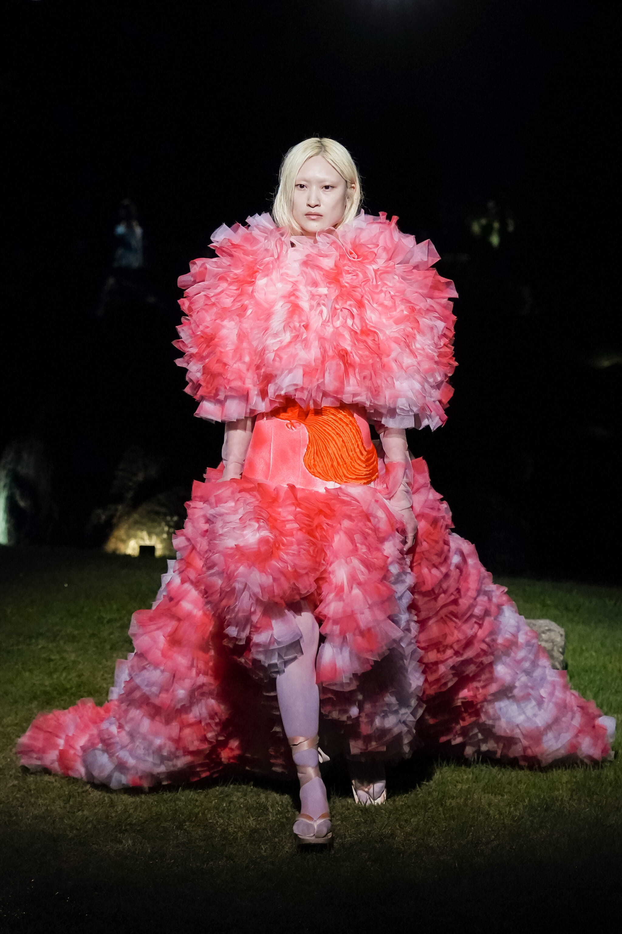 For the Kyoto show in 2021, which came at the height of COVID-19, he wanted to “bring hope,” and so he reached out to local Japanese craftspeople to incorporate Japanese motifs into the dresses using traditional embroidery techniques. Cranes flew across bodices as models of all shapes and sizes walked around Nijo Castle, their makeup done with nods to noh theater and geisha.