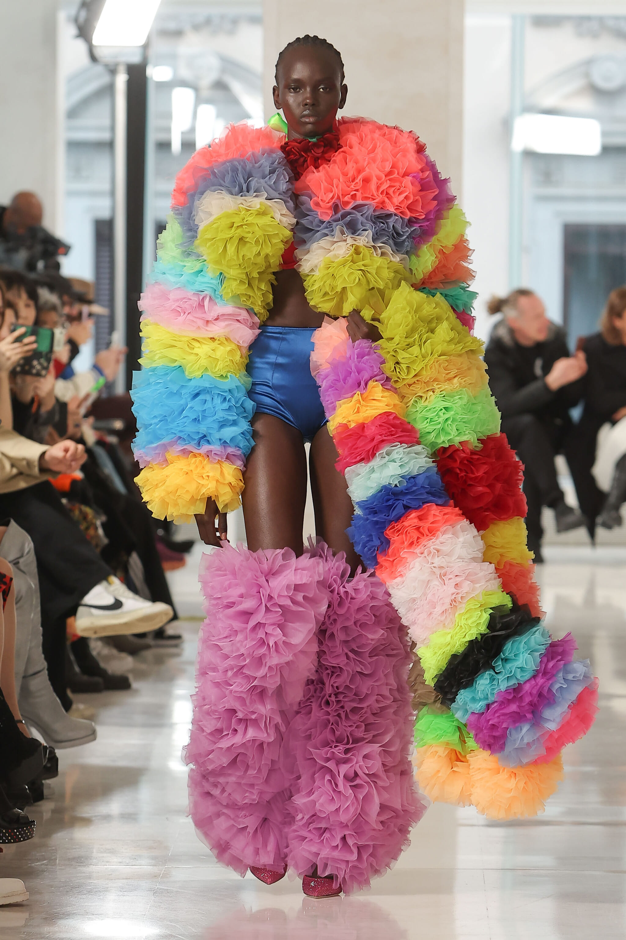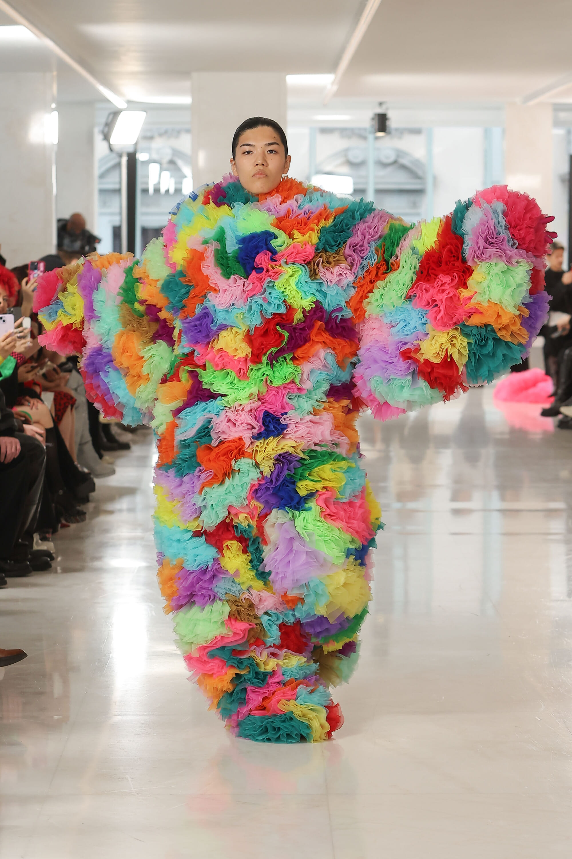The Tokyo-based designer shouts from Tokyo to the world, and has done so since 2019 when he was plucked from Instagram by the influential stylist Katie Grand. In a whirlwind three weeks, he went from Japanese costume designer to international celebrity dresser via his show, arranged by Grand, at New York Fashion Week. His first ever show outside Japan featured the likes of actor and essayist Emily Ratakojwski and models Bella Hadid and Joan Smalls. Since then, Koizumi has gone on to dress the biggest names in showbiz.