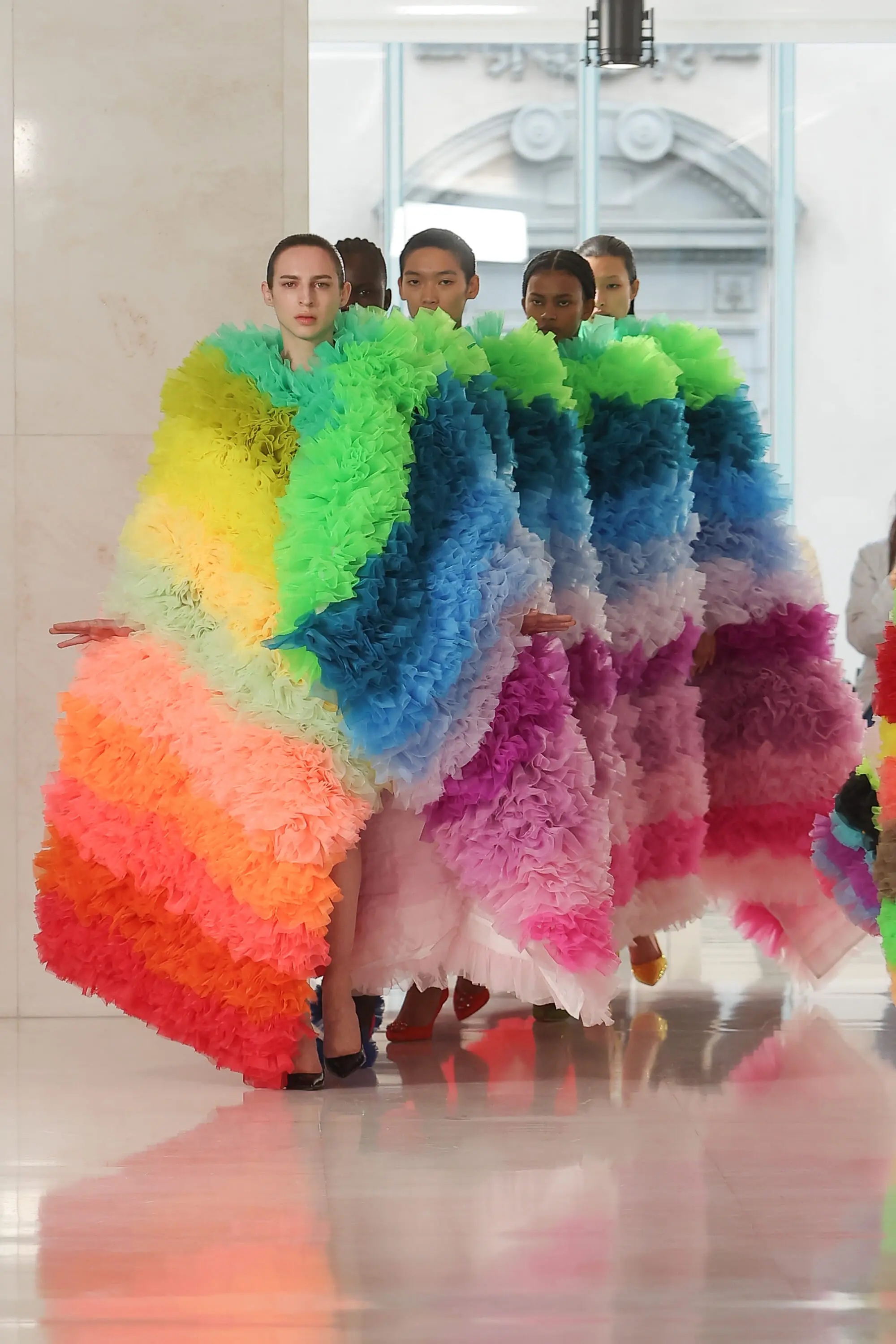In his recent Dolce & Gabbana show, Koizumi showed satin draping alongside his typical organza frills. The satin is made with a Japanese fabric called Renu, an innovative type of recycled polyester. But it’s not just about making dresses recyclable. The issue, he explains, lies in not creating in the first place, noting that he makes each dress to order.