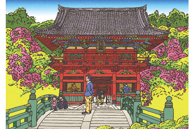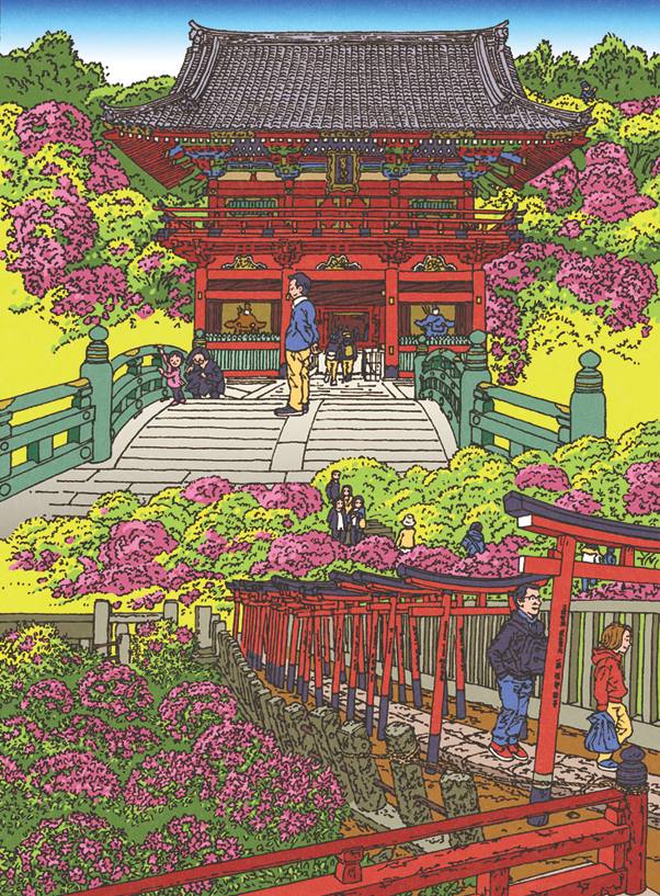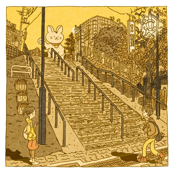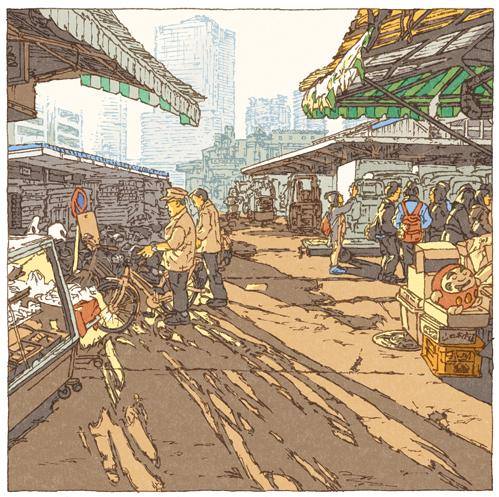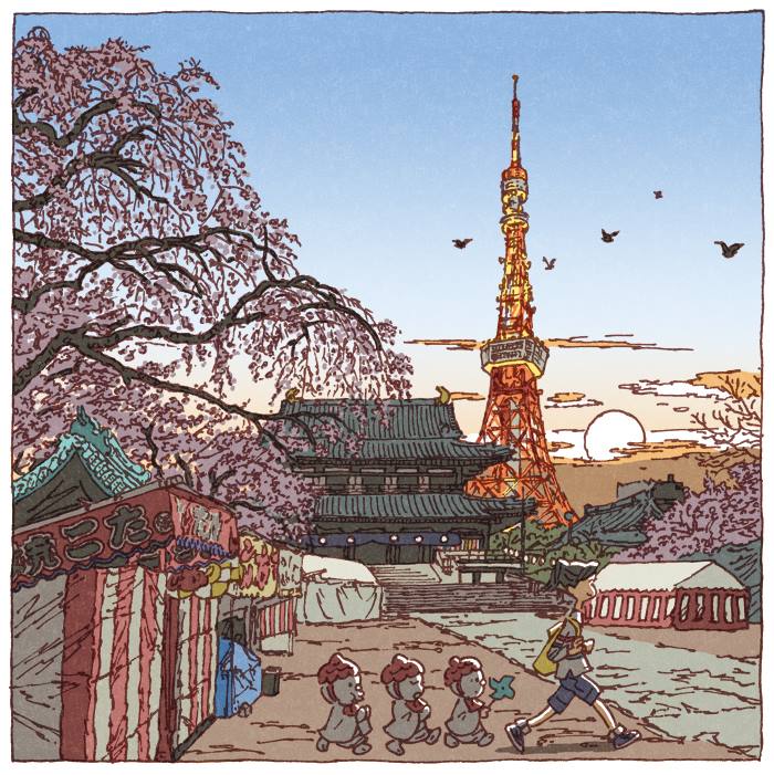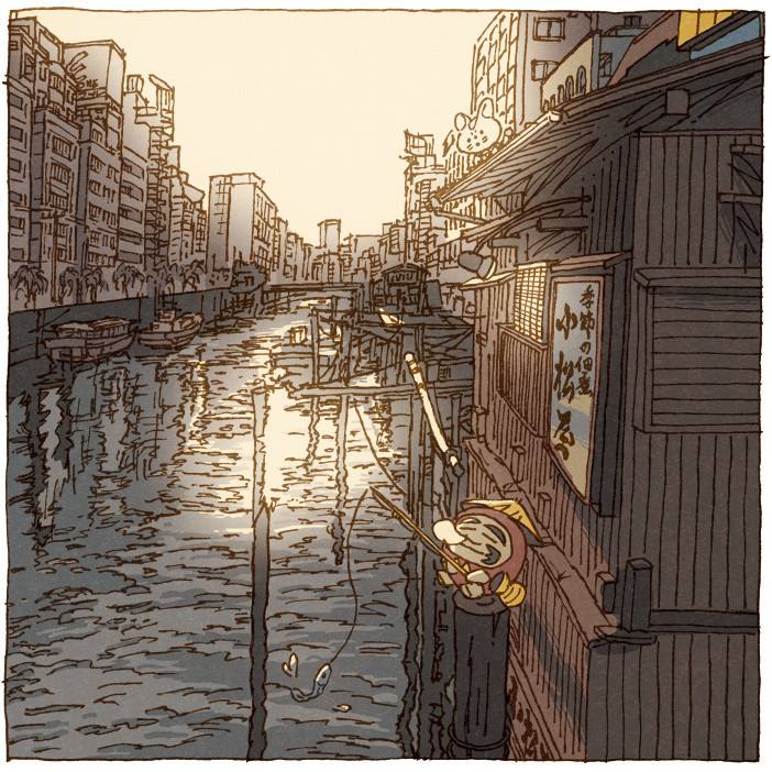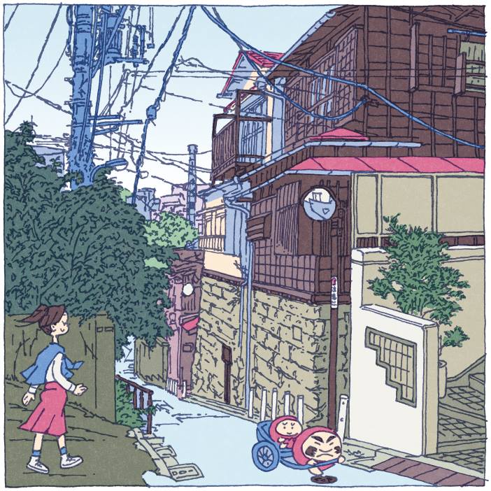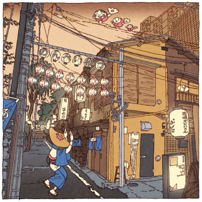 As Tsuchimochi explains, he’s a great walker and a fan of the many old and charming neighborhoods and shops to be found around the city. As any good flaneur will tell you, part of the fun of walking around is getting lost, and the illustrator sees this as all part of the process. Since June of 2014, he has been creating a series of “100 Downtown Views,” in the style of the famous woodblock printers like Hiroshige, but featuring plenty of fanciful figures playing around in the outskirts of his pictures.