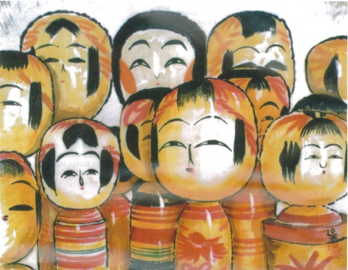 Itske Stern began taking sumi-e classes when she moved to Japan eight years ago. Sumi-e is a style of Japanese brush painting that makes use of black ink and color. If, when you hear ‘Japanese brush painting’, you imagine simple brush strokes that evoke bamboo or cherry blossoms, think again. While sumi-e can certainly involve those traditional images associated with Japan, the possibilities for subject matter and color palette are limitless. Itske’s prize-winning paintings depict colorful pink and green garden scenes, bright blue and yellow-clad children fishing in a pond, and orange and red kokeshi or traditional Japanese dolls, Itske’s other passion. She explains that she draws her inspiration from “anything and everything. My camera is my sketchpad. Everywhere I look I see a picture, and if I see something that really inspires me, I paint it.”
