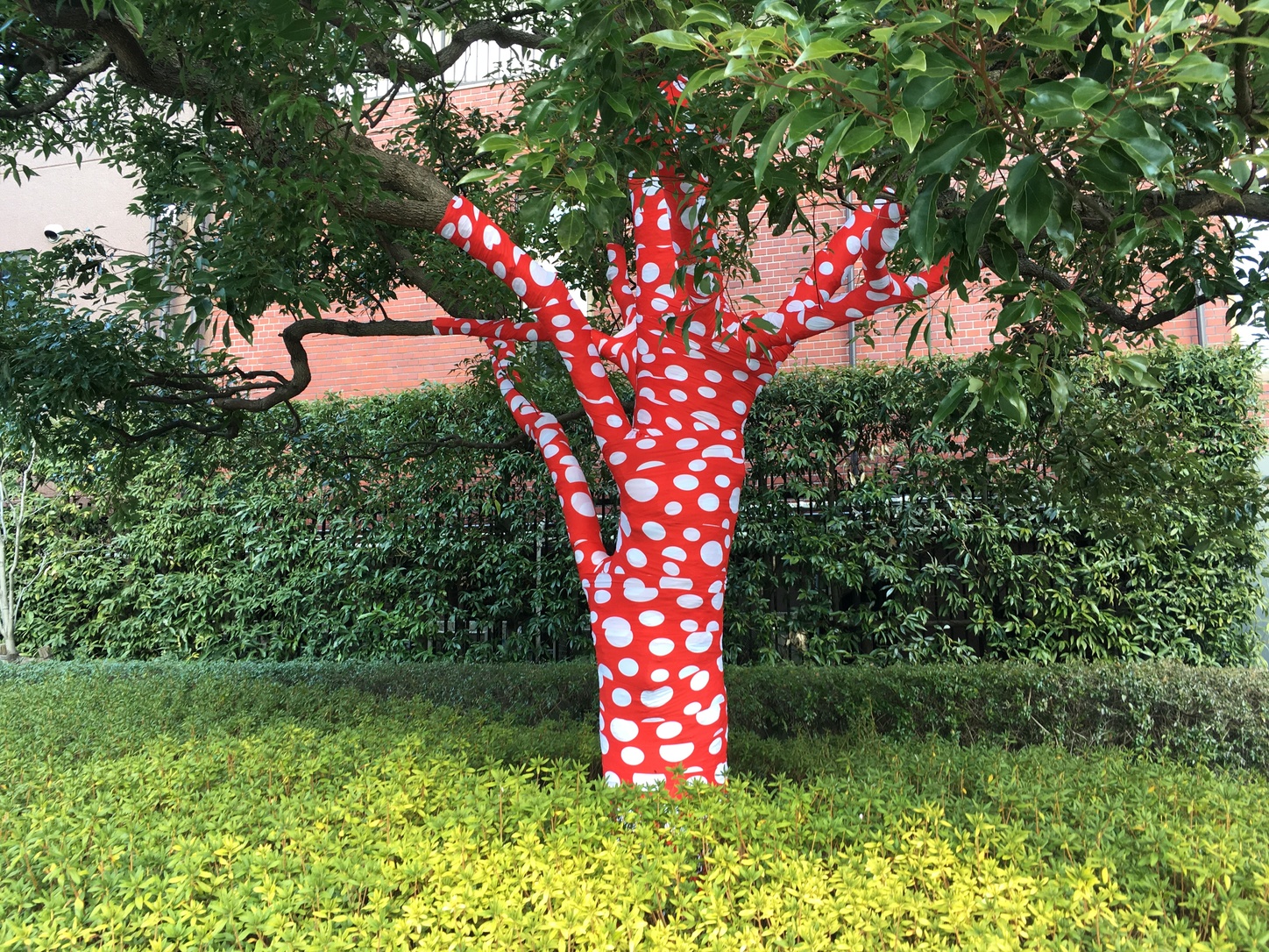 At the entrance to the National Art Center in Roppongi, even the trees have been Yayoi Kusama-fied