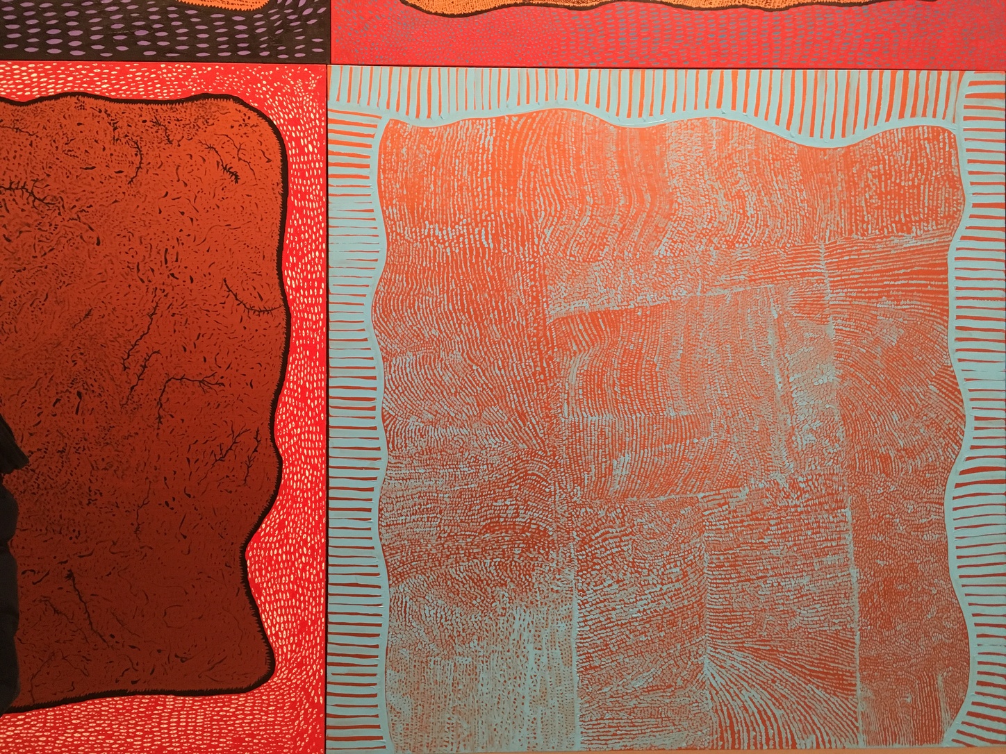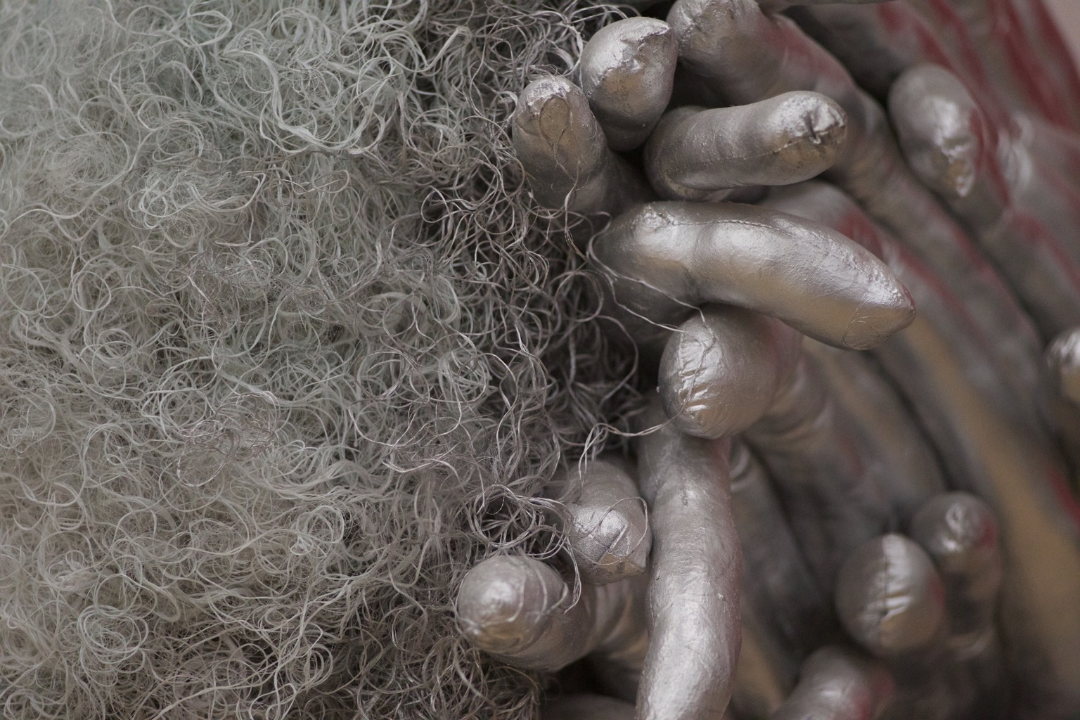 The main hall at the exhibition is filled with wall-to-wall paintings, and one of her bright sculptures