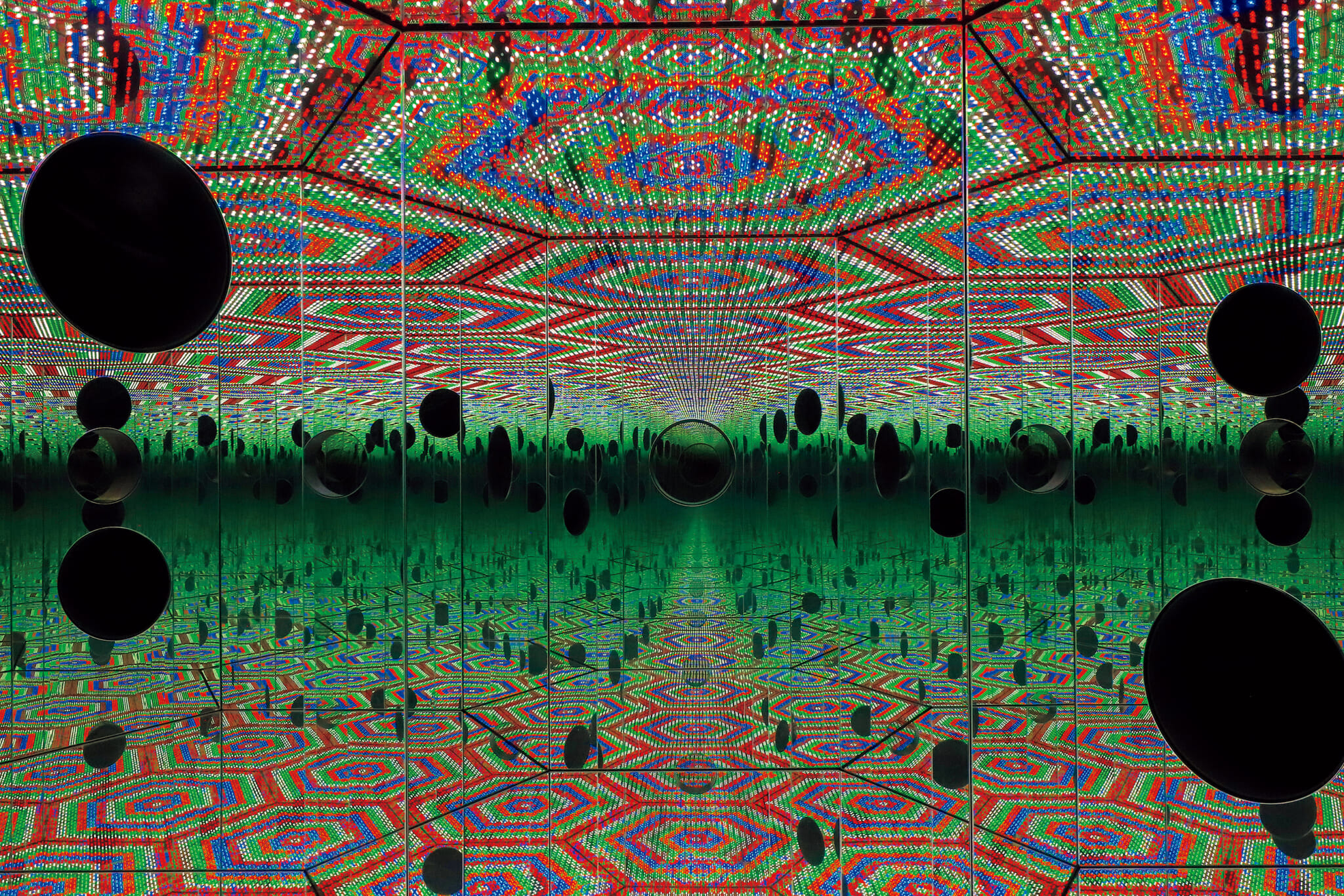 Kusama first developed hexagonal mirror and electric light pieces in the 1960s. She poignantly revisits this concept in this 2023 piece. Peeking into holes, viewers discover an infinite expanse of reflections, identities merging into a psychedelic landscape to become part of Kusama’s cosmic kaleidoscope. In this piece, Kusama honors each and every wish for peace thereby not devaluing the individual in the act of dissolution, instead advancing a transcendent universal interconnectedness. The repetitive fragments of self create a sense of infinity and dissolution. Faces become a dazzling shared happening that only the participants can witness as they become integral to a shared, mysterious, grand design. The experience is a reward for willing to peek into the unknown. Through these captivating experiences, the first floor prepares the viewer to embark on a transformative journey of the artist’s ongoing pursuit of self-obliteration.