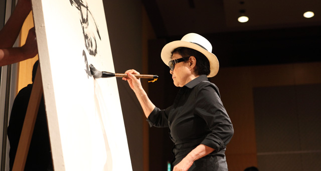 At the final edition of Mori Art Museum’s art course series “Yoko Ono – The Road of Hope” Ono gave a lecture about her life and experiences of witnessing 3/11 from abroad, and a live performance, during which she wrote a life-sized calligraphic Chinese character Yume (Dream) in front of the audience.