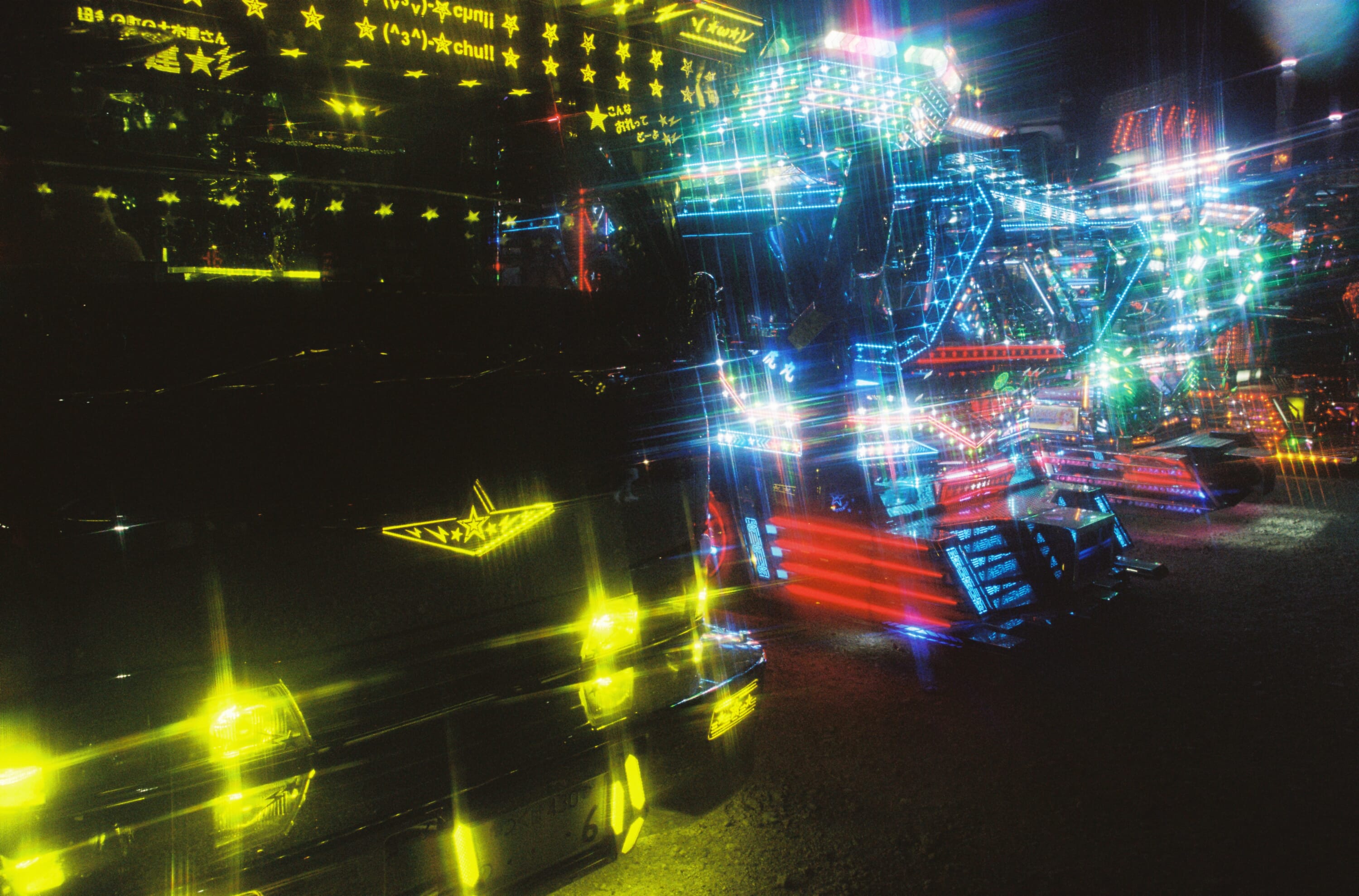 The title of Horie’s first photobook, Roman, comes from the phrase “otoko no roman,” which loosely translates to “romanticism of the male renegade.” Her distinctive style bursts from every page — hyperbolic sparkles and movement everywhere. Photos from a Coming of Age ceremony in Kitakyushu are a particular highlight. Hardcore, tough-looking men swagger around with over-the-top hairstyles, owning their campy black and gold jackets. Turn the page, and you’ll find dekotora in all their glory, sparkling lights and glitter galore.