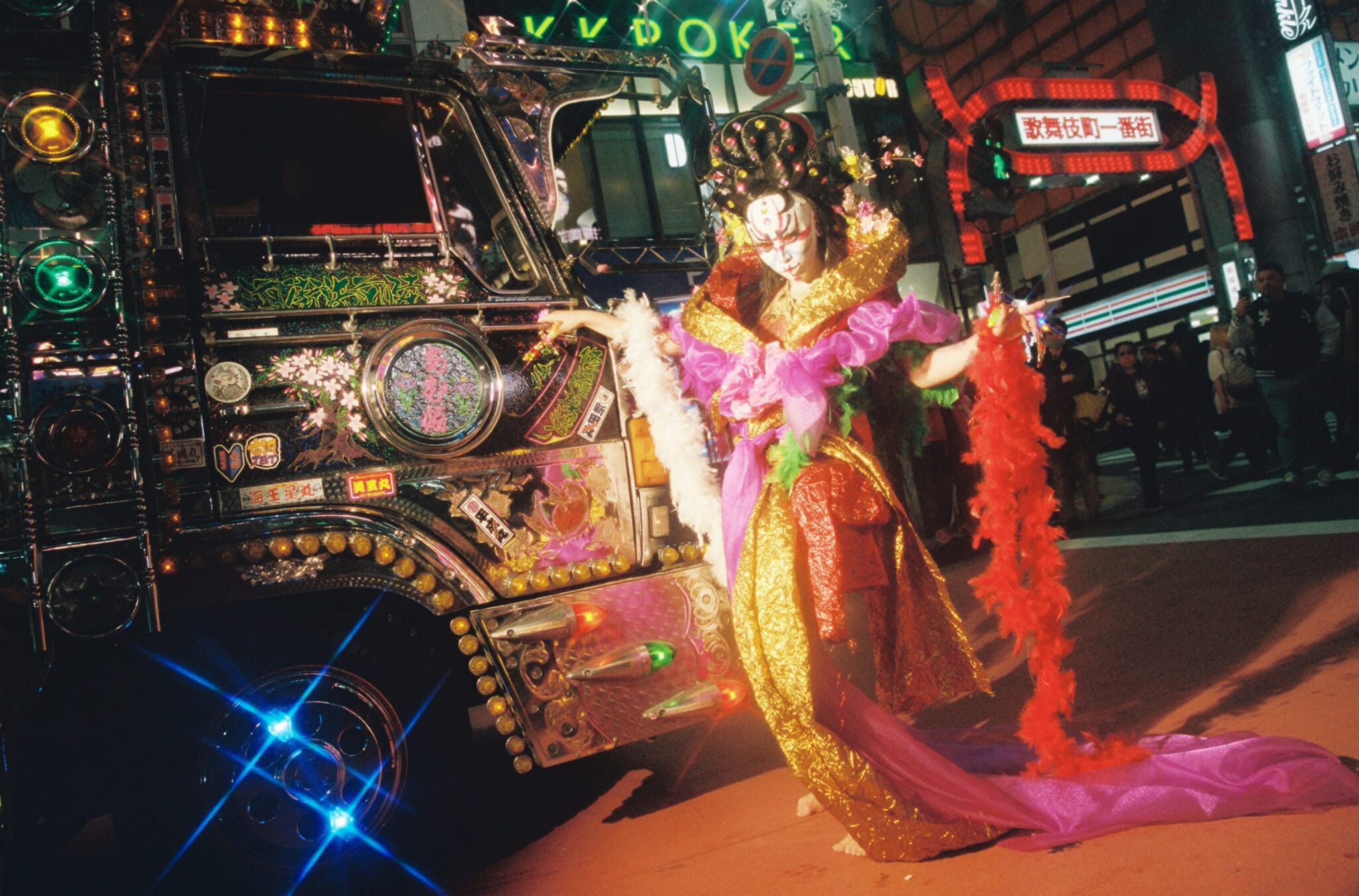 Colors. Glitter. Feathers. Sparkles. The protagonists in Yuri Horie’s world do not go by half-measures. She’s captured images of dekotora, which stands for “decorated truck”: hulking machines brightly outfitted in neon, gold and LED lights; of heavily tattooed lads sporting black and gold robes adorned with fur for Coming of Age Day; and of extravagantly groomed male gyaru posing in front of the Shibuya 109 department store. “All or nothing” seems to be the motto that unites her subjects — the brasher, the better. And Horie photographs them in a way that matches, or maybe even magnifies, their energy.
