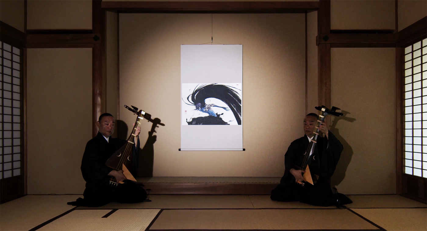 There’s a video of the ceremony played at the “Bleach / Blank, Black and Bleed” exhibition at the Shueisha Manga-Art Gallery. It shows parts of the chanting, drumming and fire-burning employed in order to ward off any evil spirits and to bring good fortune. The video also includes parts of a biwa performance by Kakushin Tomoyoshi held in a room in Jindaiji Temple, in front of one of the Bleach scrolls. That is followed by videos of how the special Bleach art was made.