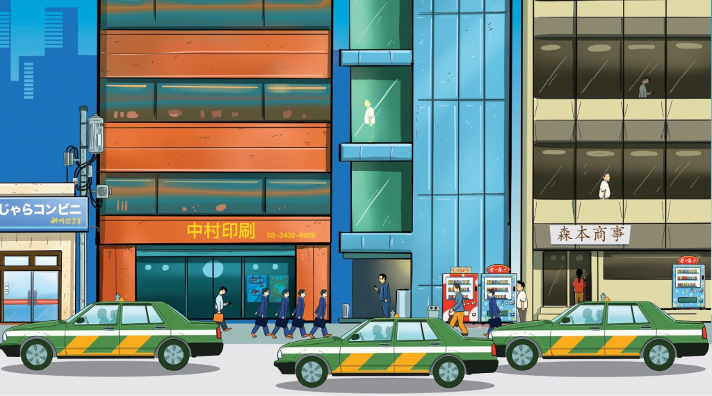 I first visited the business districts of Tokyo several years ago. I had forgotten how vertical it was. I keep looking up to the sky trying to find the end of each building; the architecture is quite different from what I have seen so far. The shotengai and shitamachi almost seem like another country. I can’t wait to start drawing these tall buildings. They will provide something different from the everyday Tokyo that most people are familiar with. I notice that everywhere I look, I see the same person. An average man, black hair, dressed in a black suit, white shirt, blueish tie and a briefcase in hand. There are several groups of them now, flocking around here and there. Suddenly I get it: Salarymen. If there are so many, this must be their natural environment.
