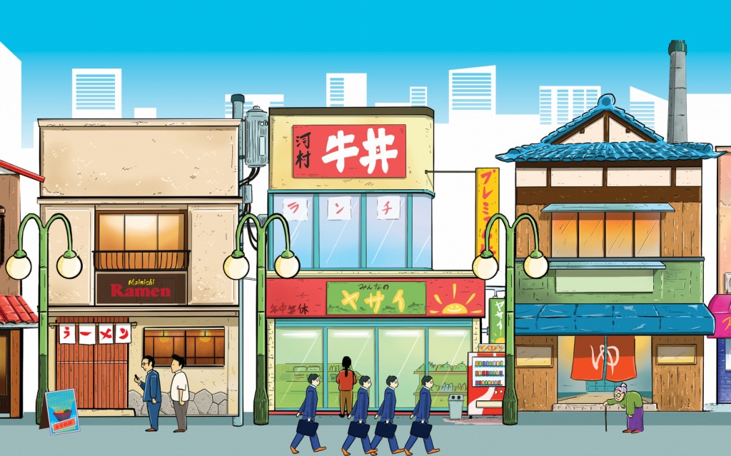 It is hard to tell what year it is. I see old storefronts, new buildings, ramen shops and pachinko parlors. “This architecture doesn’t really make sense,” I thought. There is a stylish Chinese restaurant with red bricks neighboring a washed-out hair salon straight from the mid-’70s. Behind me, a shoeshine shop with a storefront decorated with three unmatching colors and a restaurant with a blinking signboard reading “cheap & big!”