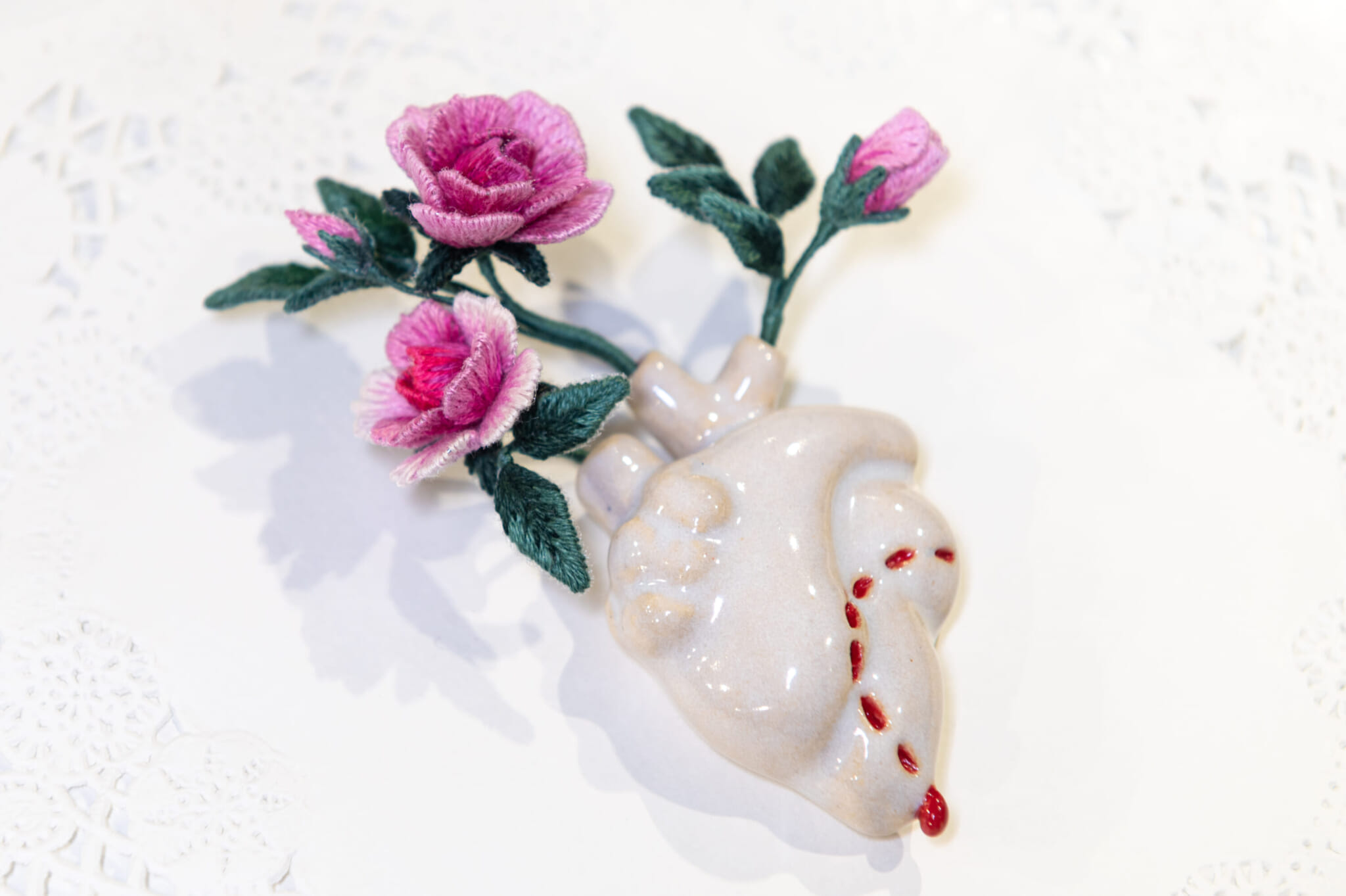 Bitten Heart Brooch (2023): Ceramic. Stumpwork