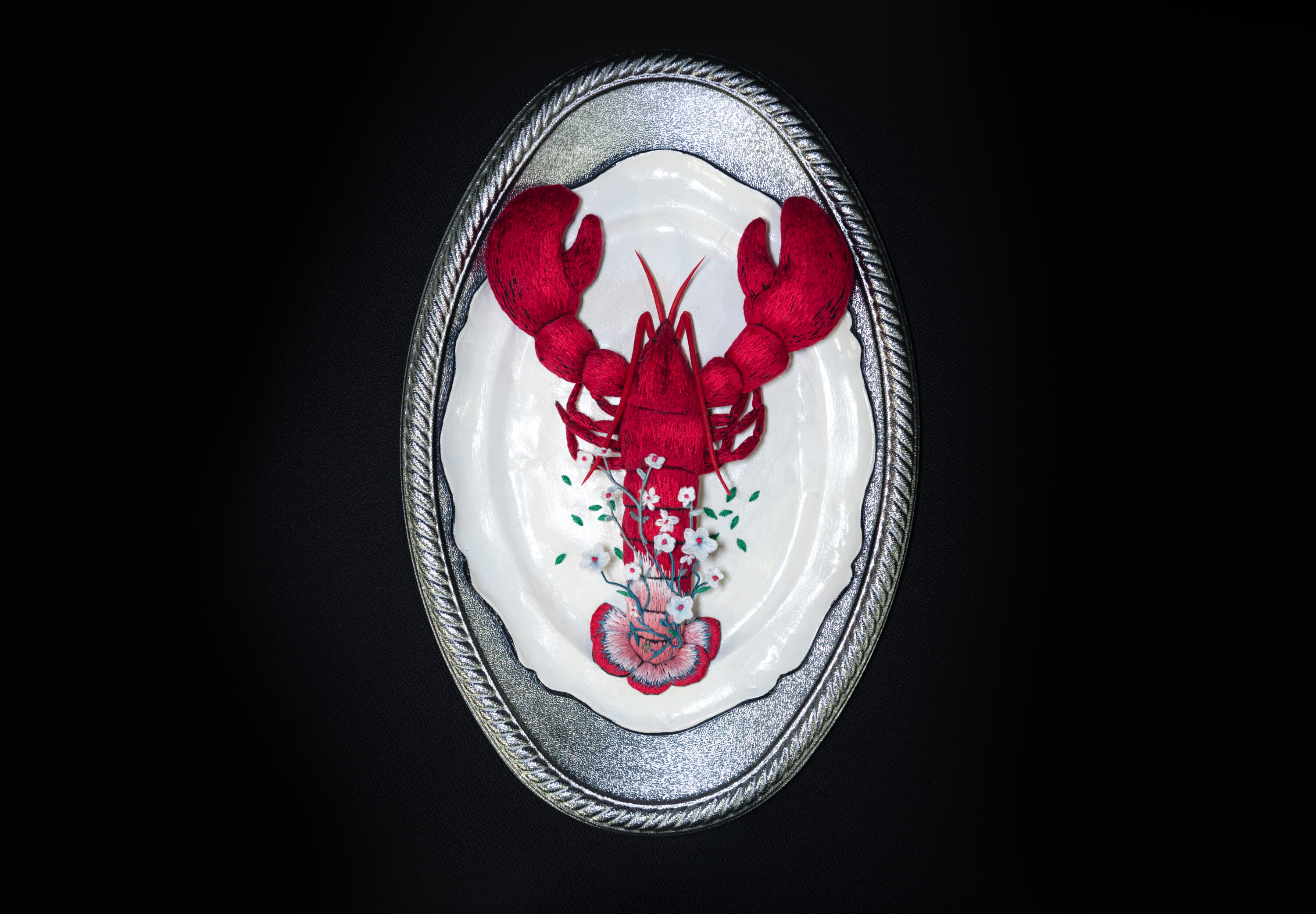 In late 2022, Chika Mizusawa — best known under the moniker Genkakulemon — served up a feast fit for a twisted Alice in Wonderland banquet. On the menu: a bright blue embroidered fish bleeding yellow blood and flowers onto a ceramic white plate, a vermillion rose with a steak at its center, and a vibrant red lobster growing a bouquet across its lower abdomen.