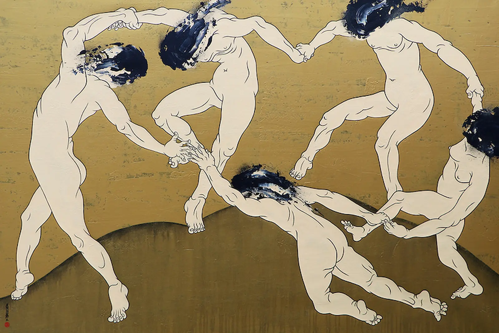 “We-e jya naika -Dance-” (2024), which references Henri Matisse’s Fauvist masterpiece “Dance (I)” (1909), stands out among his ukiyo-e inspired works for its Western connection. Although Yamaguchi employs his signature blend of flatness and depth, brushed and smooth textures and a rich, gold backdrop here, the work’s ode to Matisse lends a new hybridity to his Shinto-influenced oeuvre. At Art Fair Tokyo this year, Yamaguchi is represented by Ain Soph Dispatch.