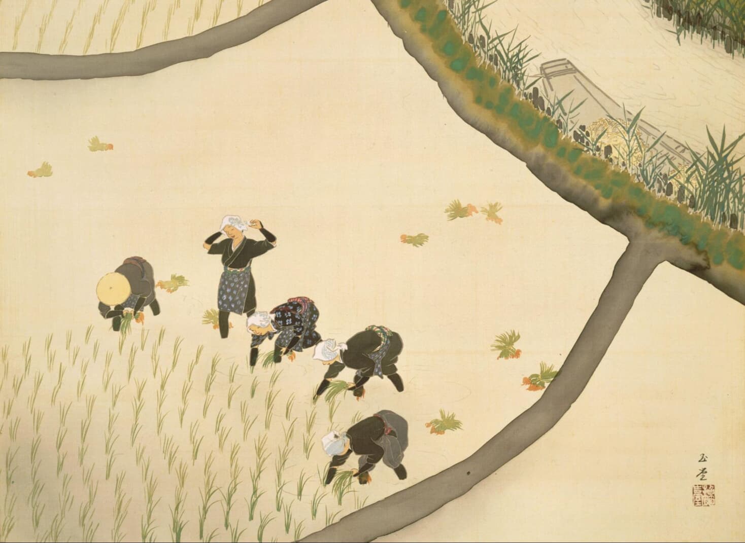 Kawai Gyokudo, Young Ladies Planting Rice. Color on Silk, Showa Period, 1945; Yamatane Museum of Art