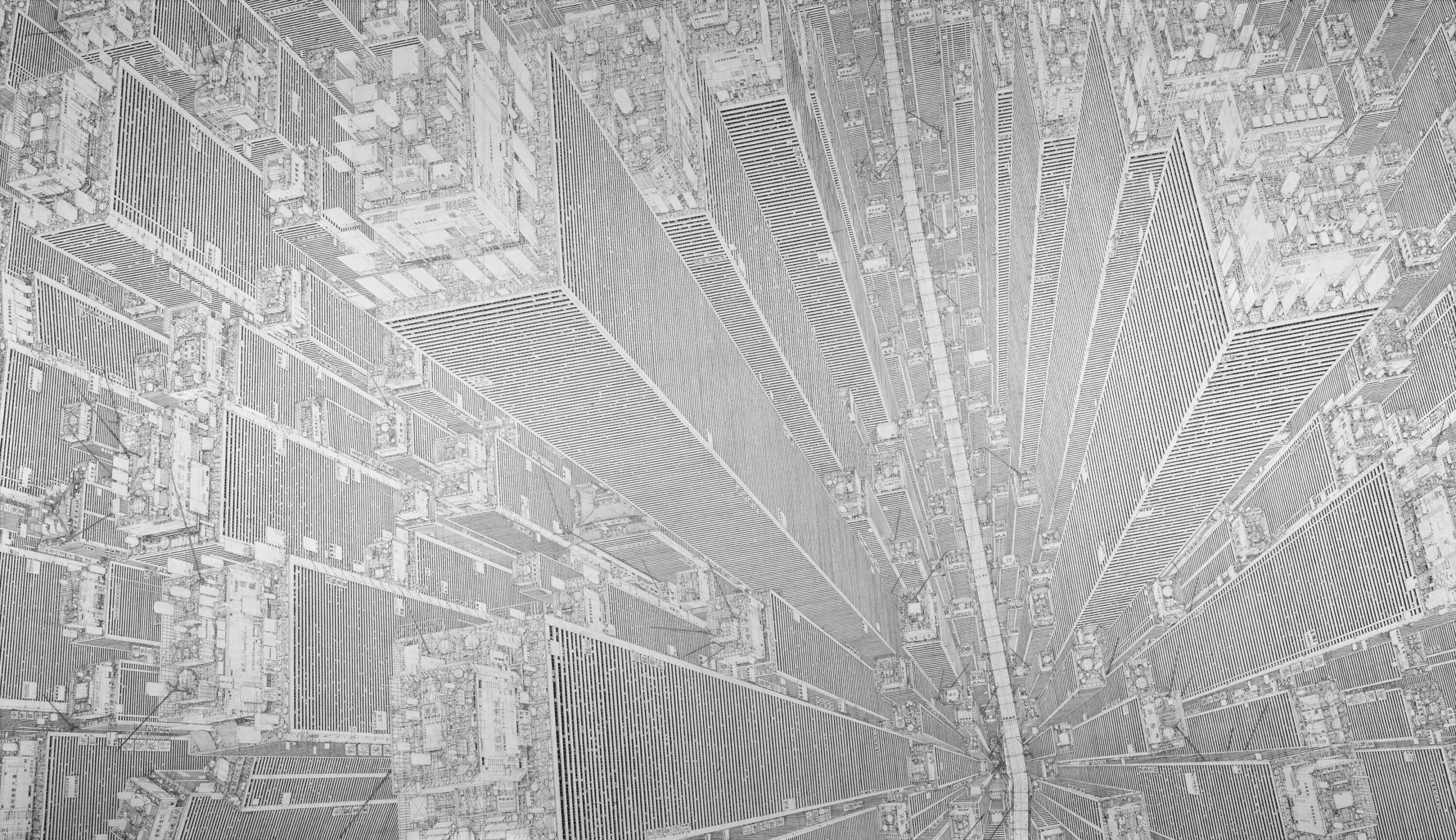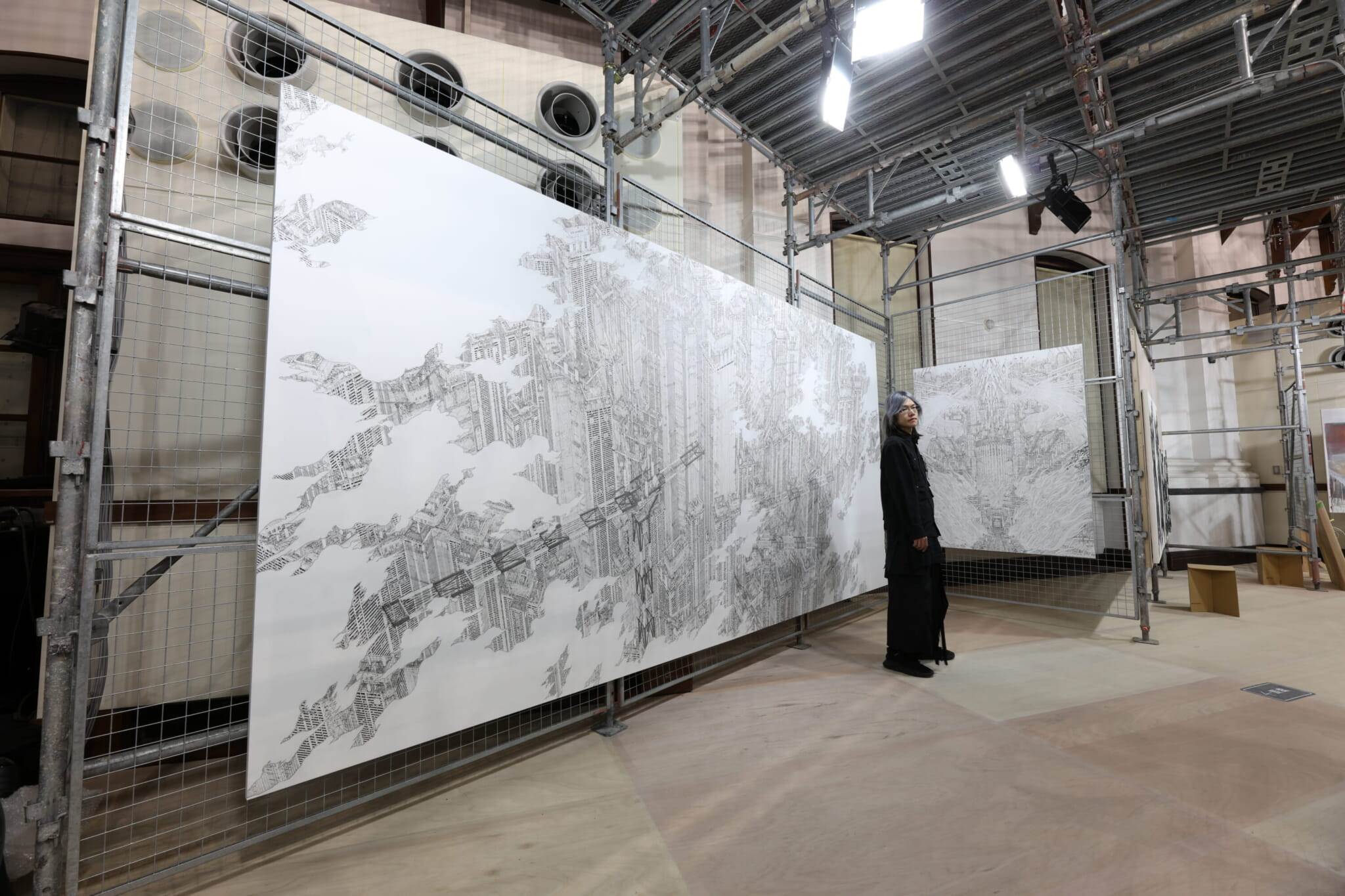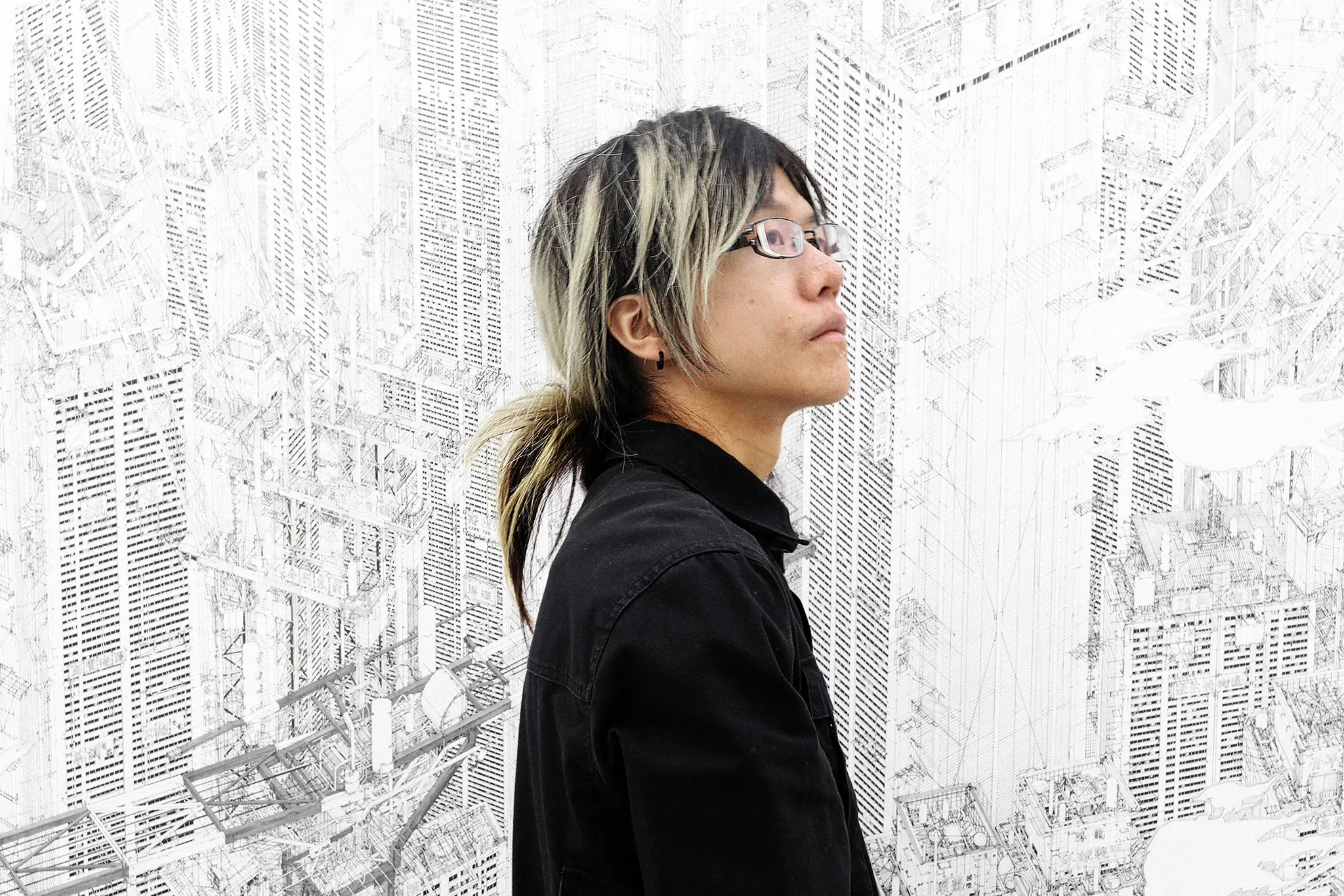 Tajima’s artworks are massive panels with dense urban cityscapes meticulously drawn in sharp black and white lines. His thousands of Instagram followers experience these works in fragments as small as the palm of their hands on their screens, but at Tajima’s exhibitions, the half-imaginary megalopolises fill up the walls and draw the viewer in, as if magical portals.