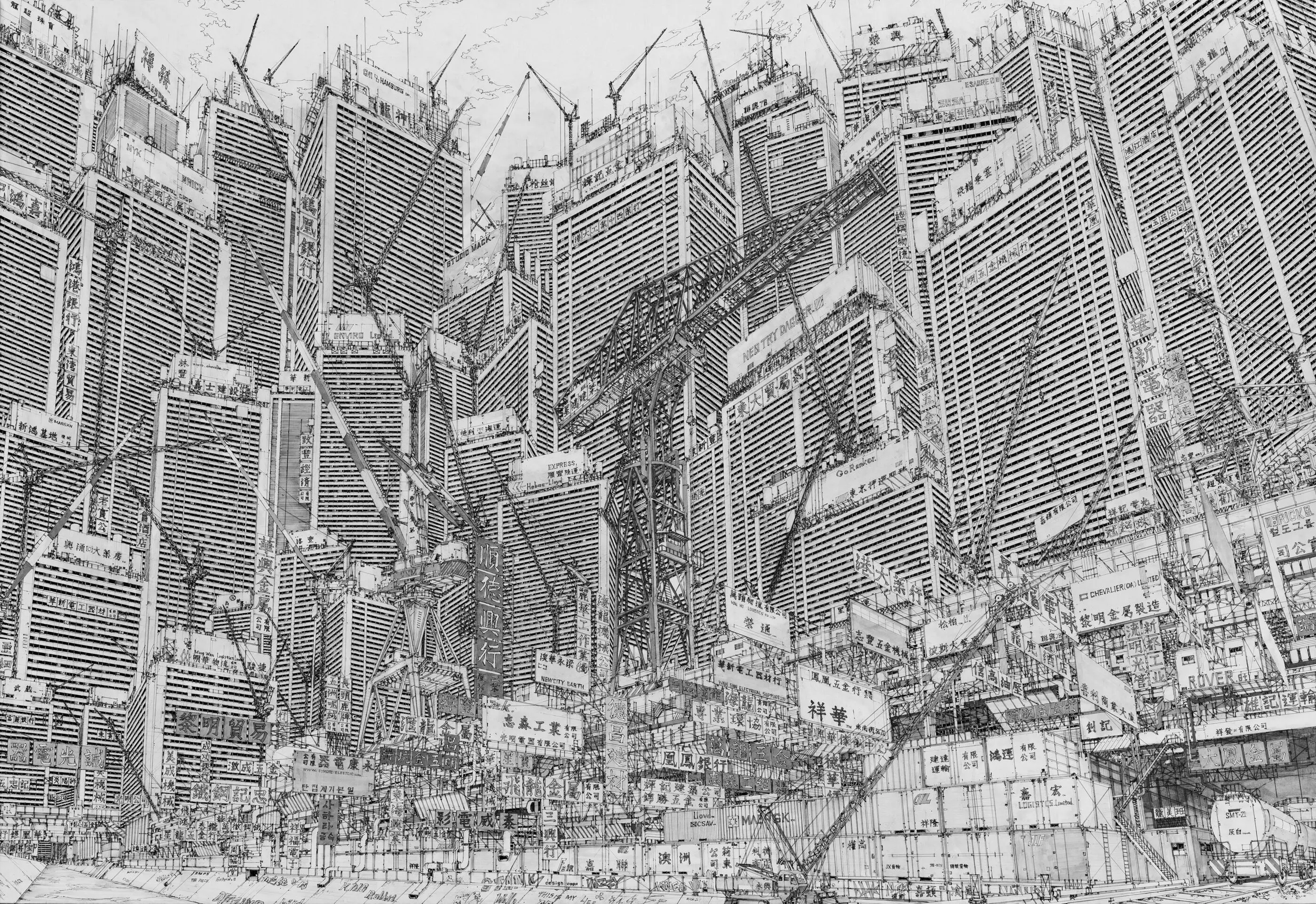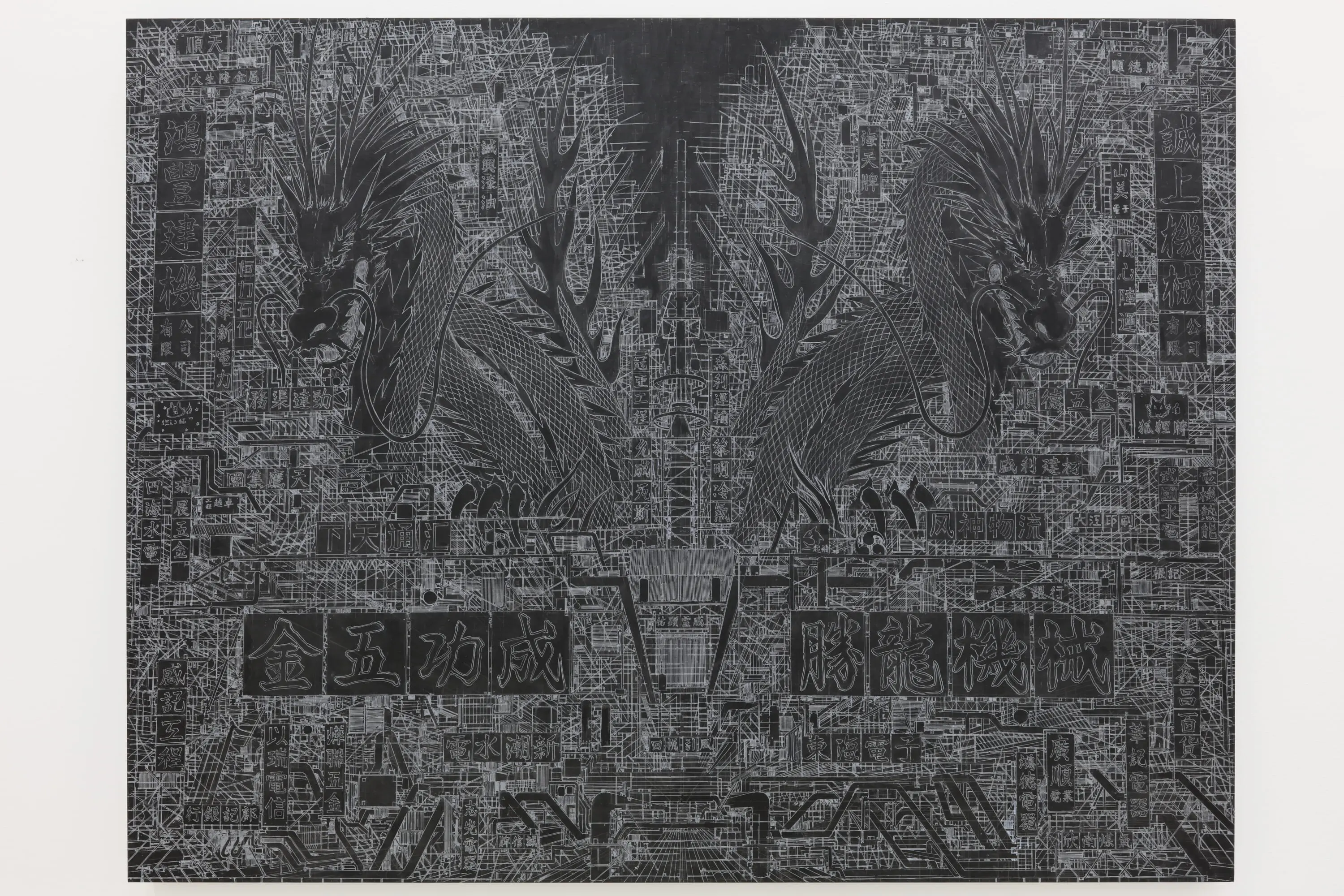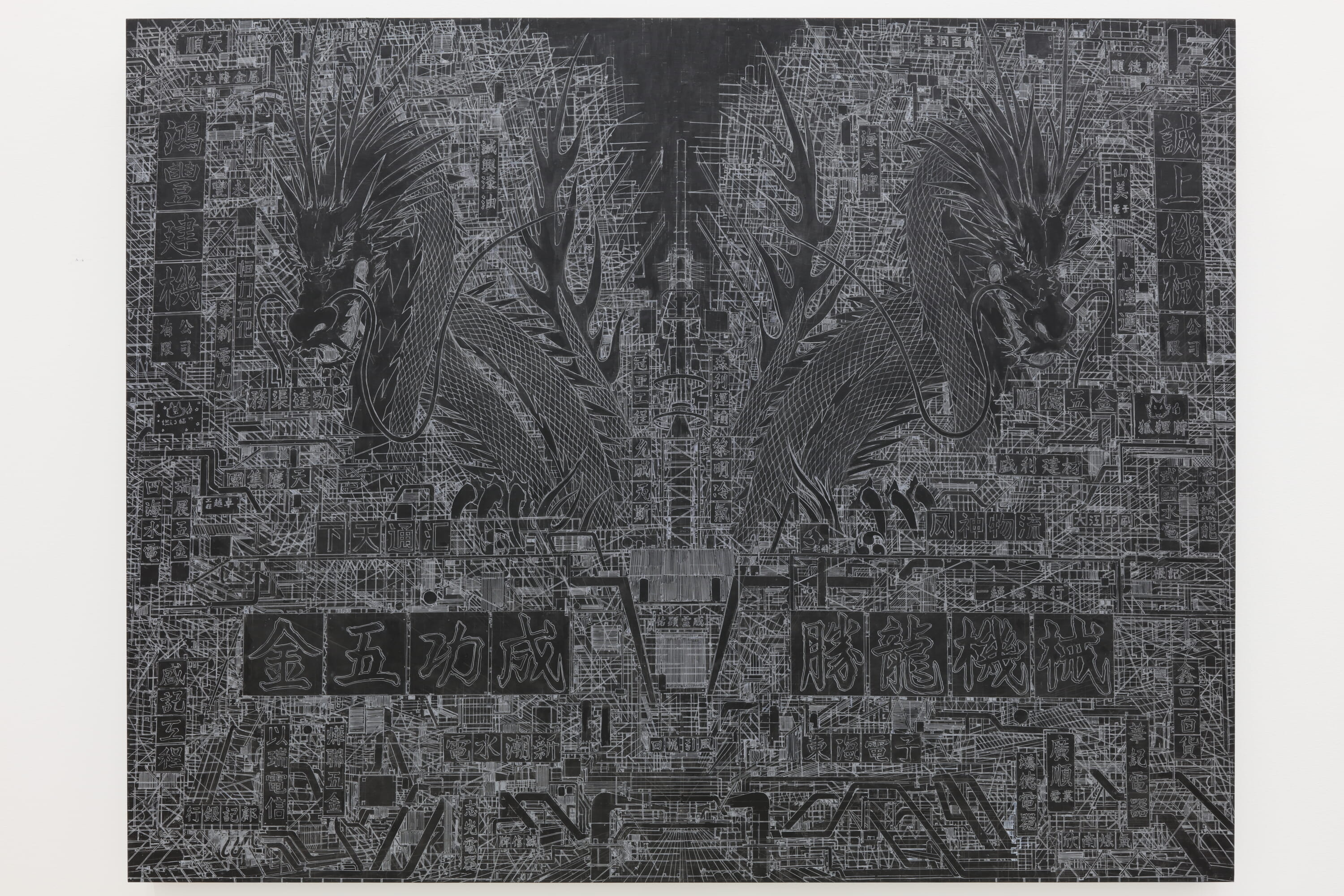 Tajima subsequently started spending as much time as possible traveling to that “elsewhere.” Those concrete and glass jungles are the source of his unending inspiration, as he rebuilds and rearranges his memories while cooped up in his studio in rural Nara without meeting a soul. In turn, his detailed cityscapes busy with construction cranes, kanji signs and the occasional dragon are taking him back to major cities for exhibitions and have won him awards such as the Tokyo Midtown Award Grand Prize in 2015 and the Taro Okamoto Special Award in 2019.