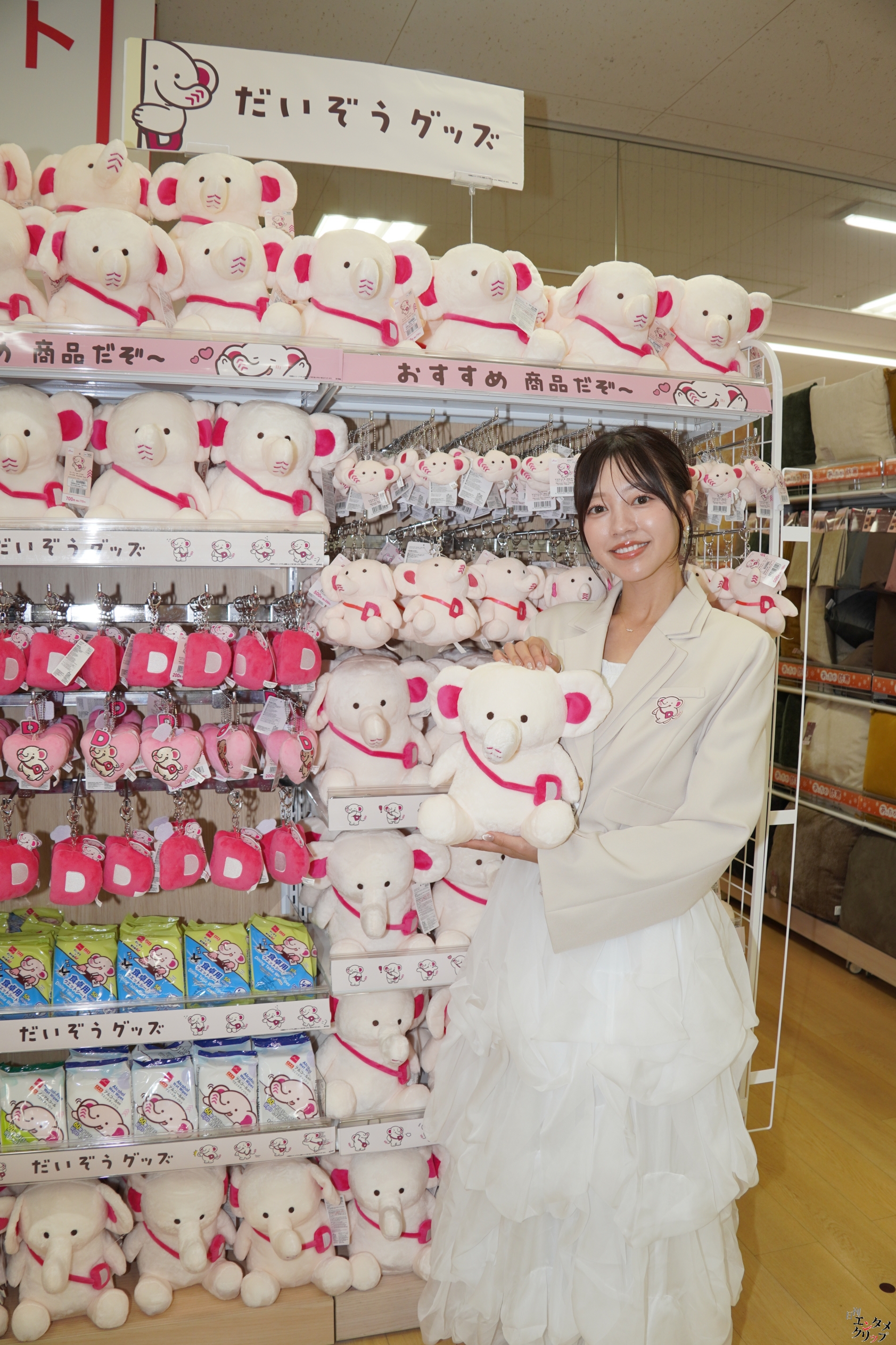 Daiso ambassador Yumi Takagi showing Daizou’s official merchandise.
