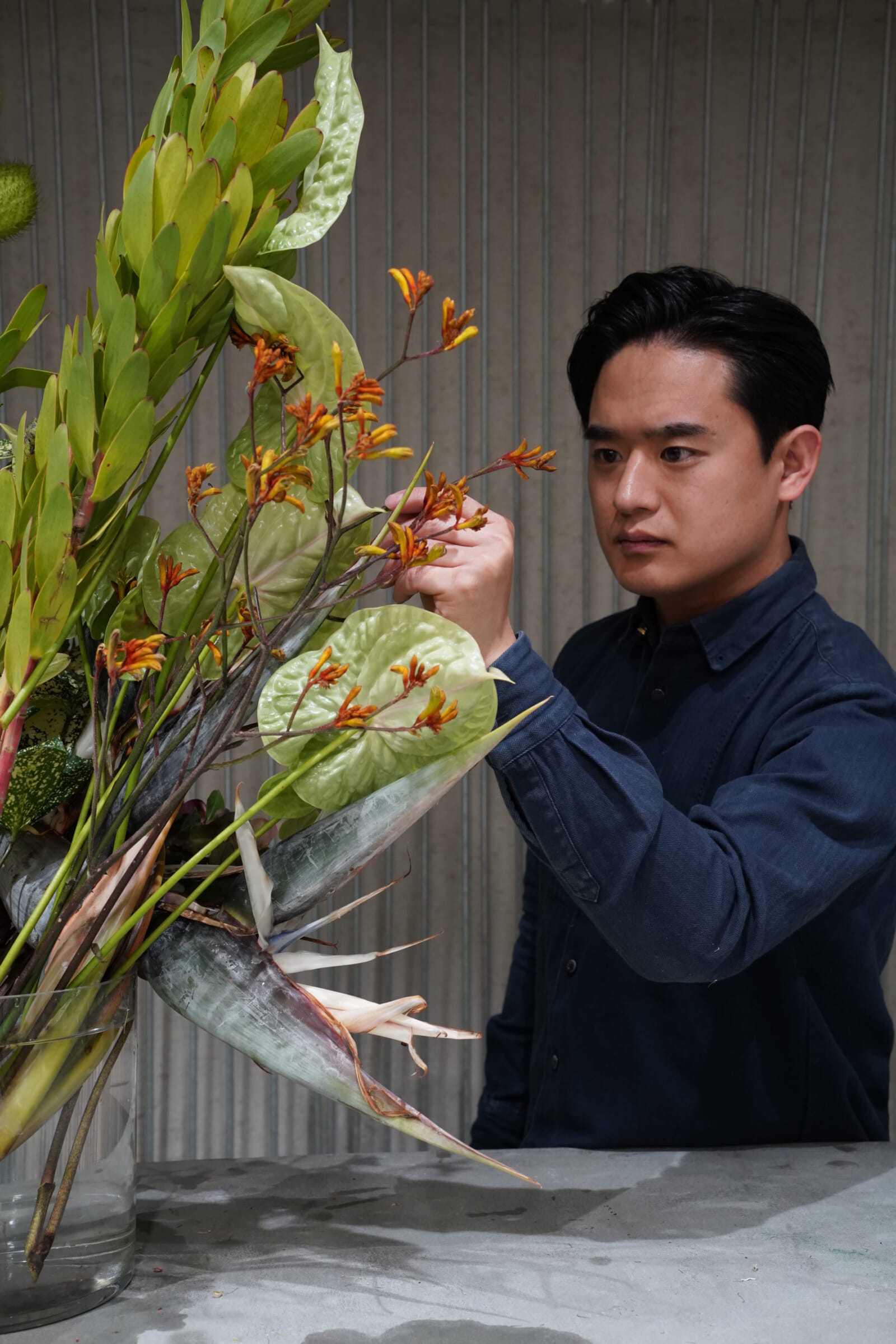 Sakamoto’s journey into floristry didn’t begin with childhood dreams or formal training, but rather in a period of silence and reflection: During the pandemic, he suddenly found himself with hours of unfilled time. One afternoon, on impulse, he decided to get rid of all the furniture in his room except for his desk. When he stepped back to look at what he’d done, the space felt hollow.