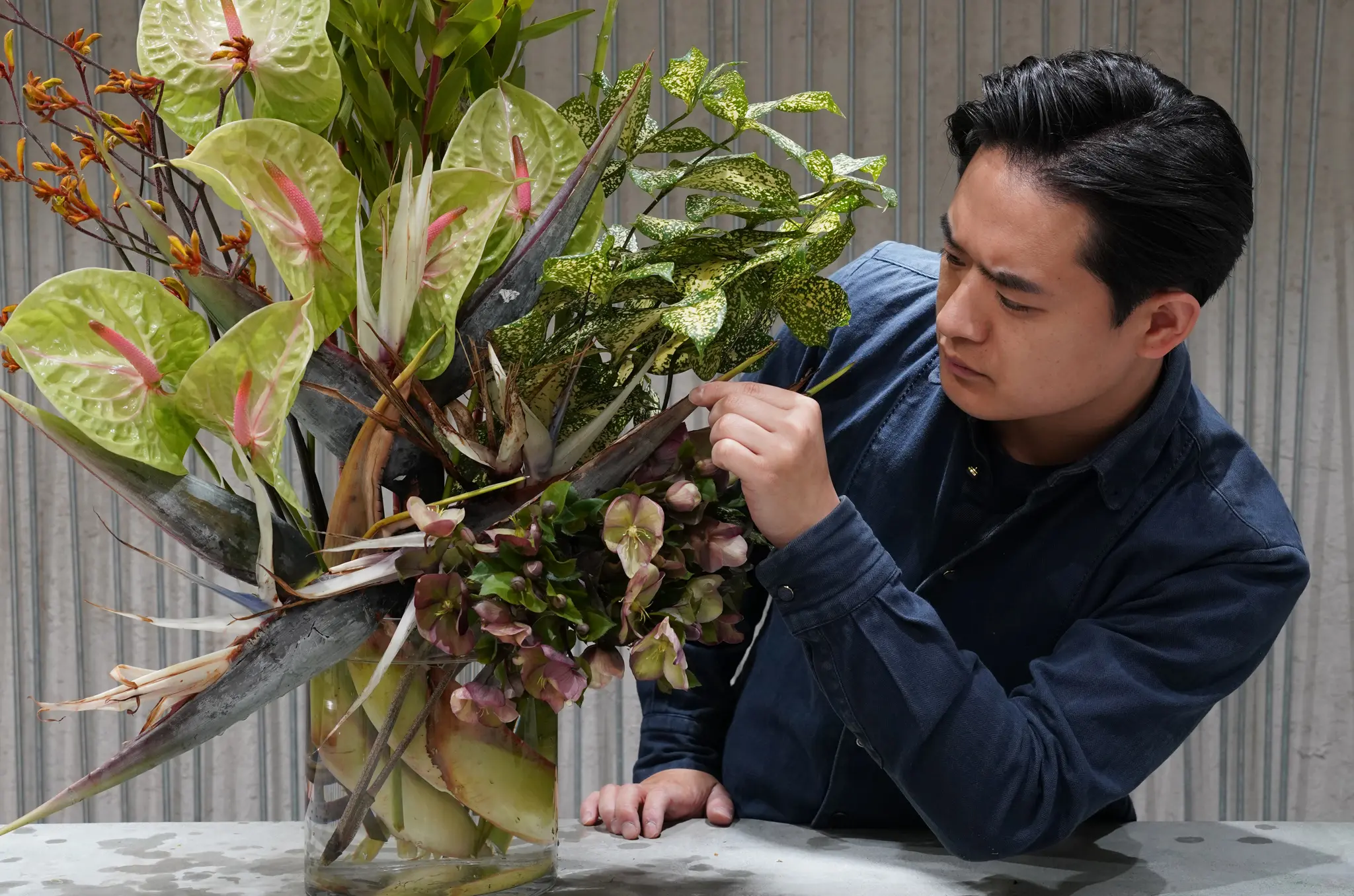 Sakamoto’s journey into floristry didn’t begin with childhood dreams or formal training, but rather in a period of silence and reflection: During the pandemic, he suddenly found himself with hours of unfilled time. One afternoon, on impulse, he decided to get rid of all the furniture in his room except for his desk. When he stepped back to look at what he’d done, the space felt hollow.