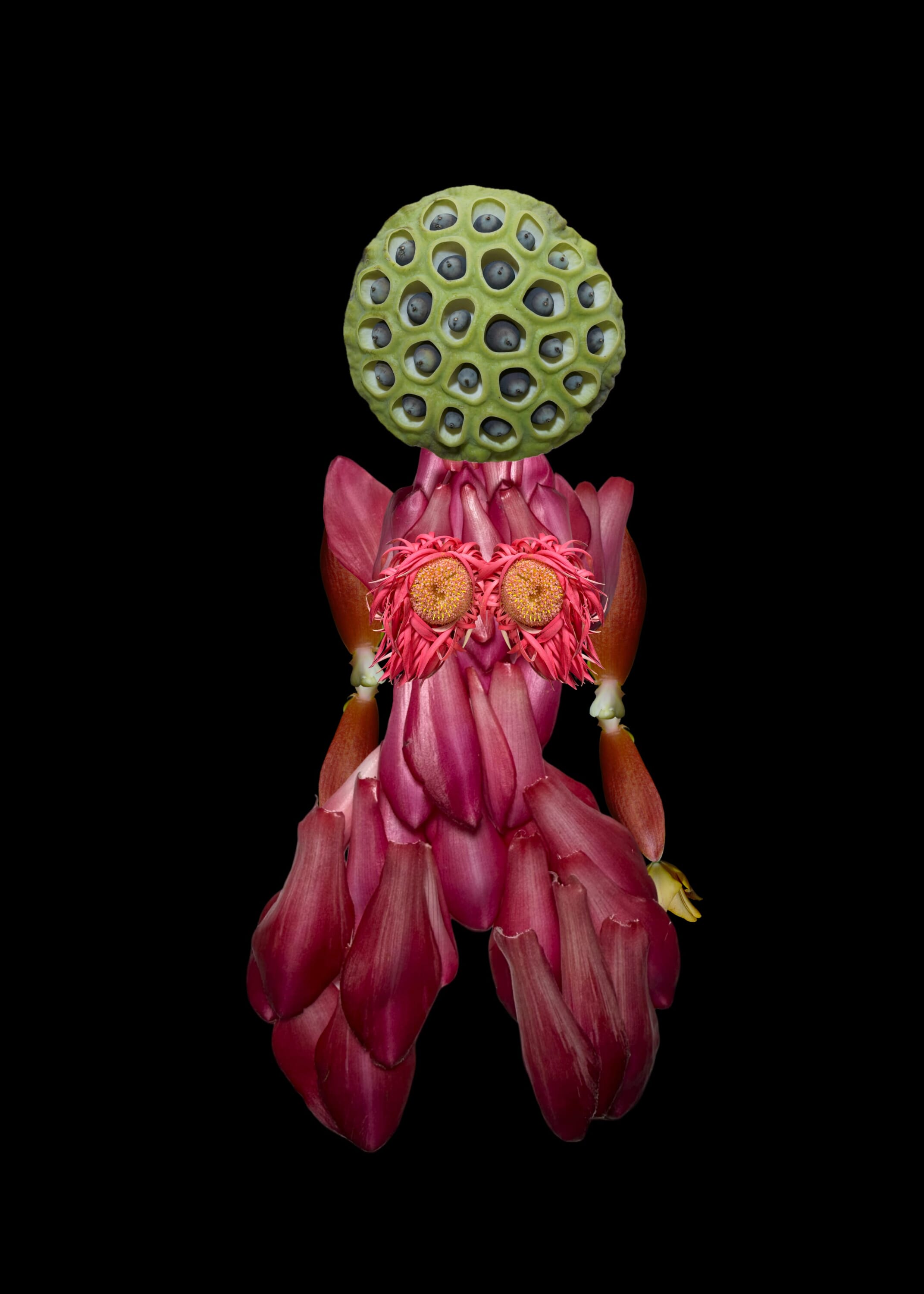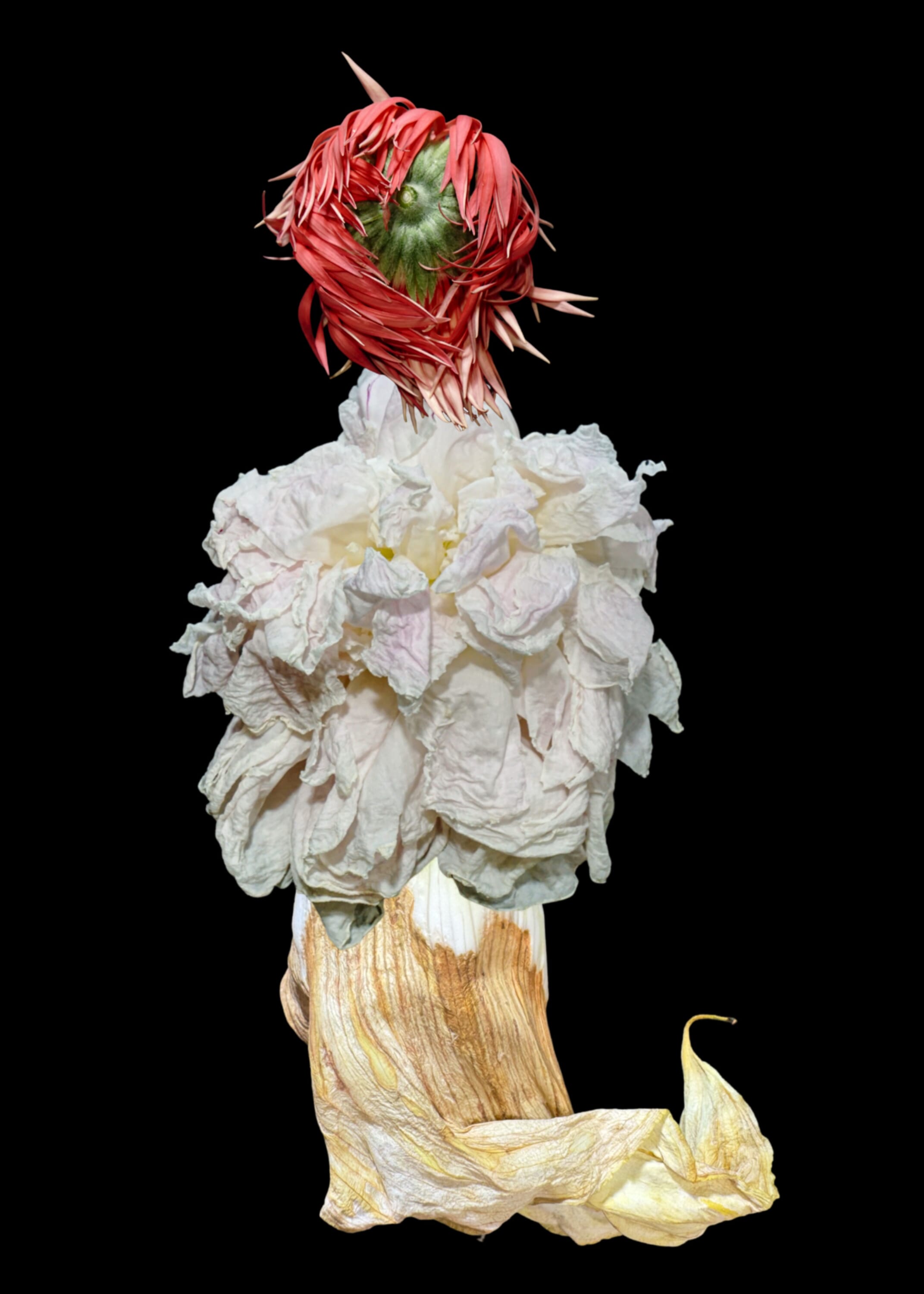 Outside live arrangements, Sakamoto also creates photographic works in which flowers become humanoid creatures. He dismantles plants, then reassembles petals, stems and roots into figures placed against a black background. Some pieces are paired with poems he writes himself. A piece called “My Eyes” shows an eyeless creature with a lotus seed head; another, called “Blooming,” shows a creature with auburn leaves as hair wearing a garment made of crumpled petals and dried leaves.