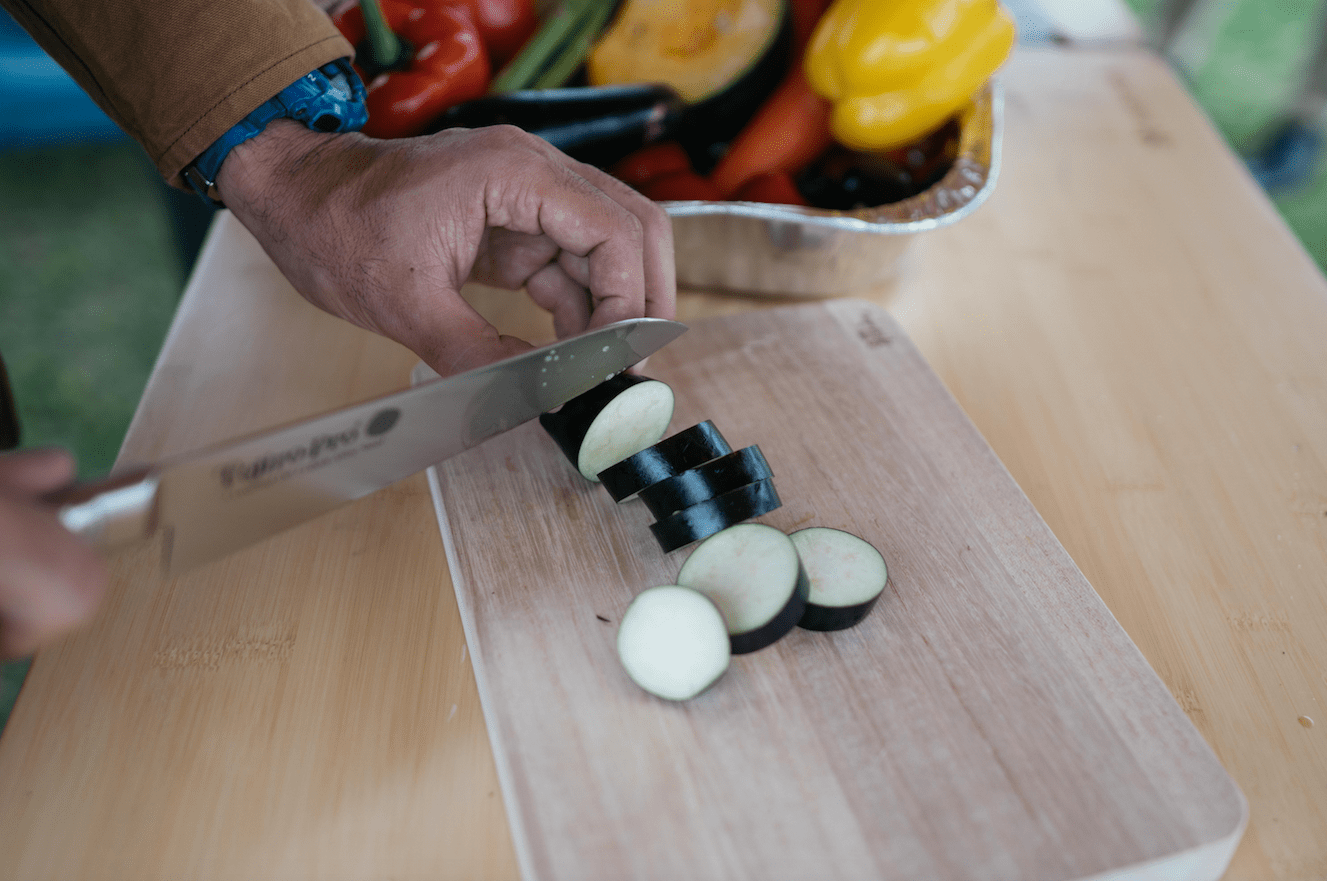 Without much time to admire the lush hills and forests around us, we started cooking lunch, using locally made knives and paulownia-wood cutting boards to slice chicken, cut pork ribs, and chop vegetables with ease. Since we were camping, it was only fitting that we had a great big barbeque. We picked up marinated meat slab after meat slab with some narrow-tipped tongs that stood up without support when placed down on the table. While it may seem like a minor detail, not having to worry about the tip of your tongs getting covered in muck while rushing about cooking was a surprisingly welcome treat. Lunch was a feast of grilled vegetables, chicken marinated in yogurt and miso mixture, lightly toasted rice balls, and Spanish Gambas al Ajillo appetizer with mouth-watering shrimp.