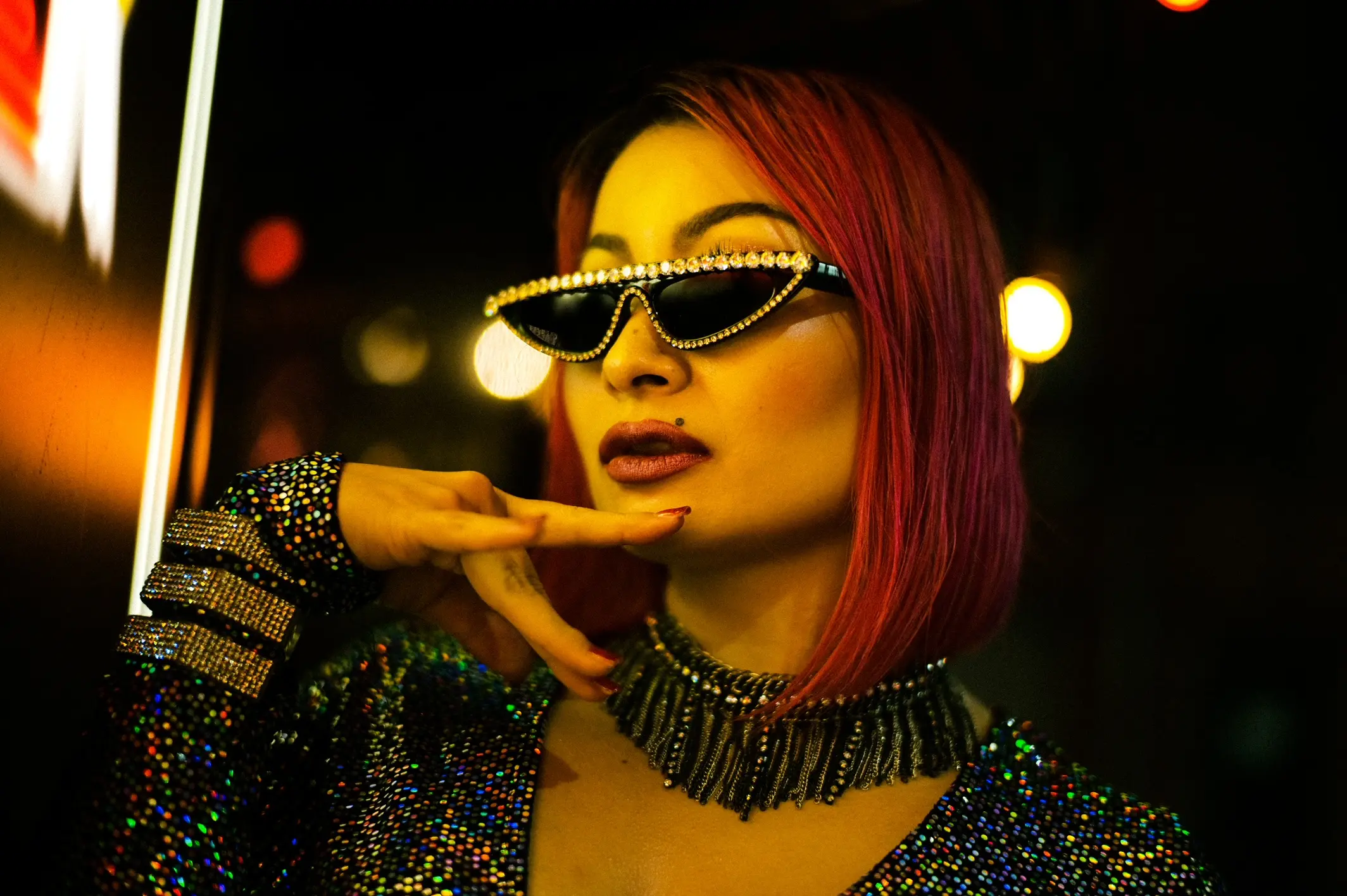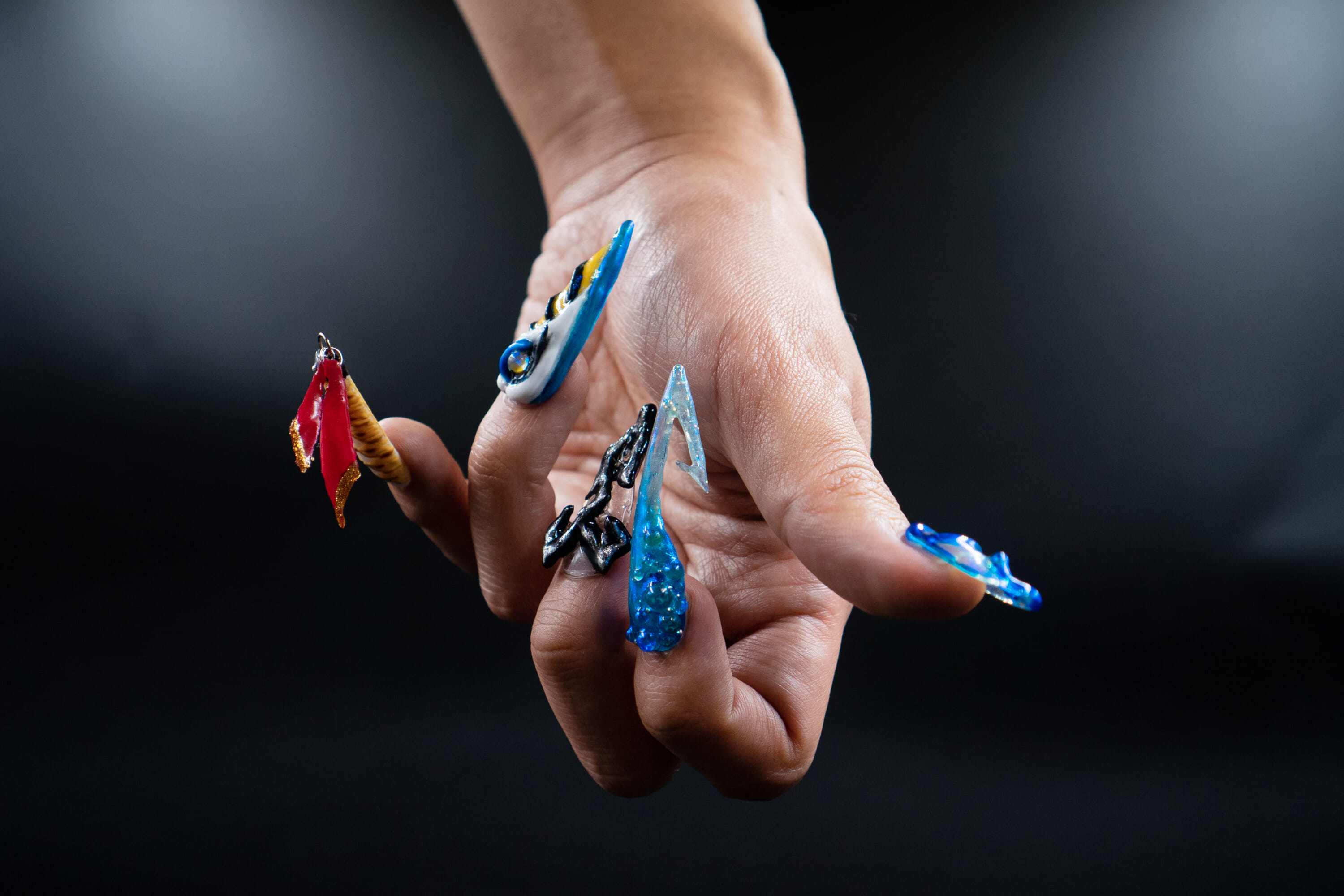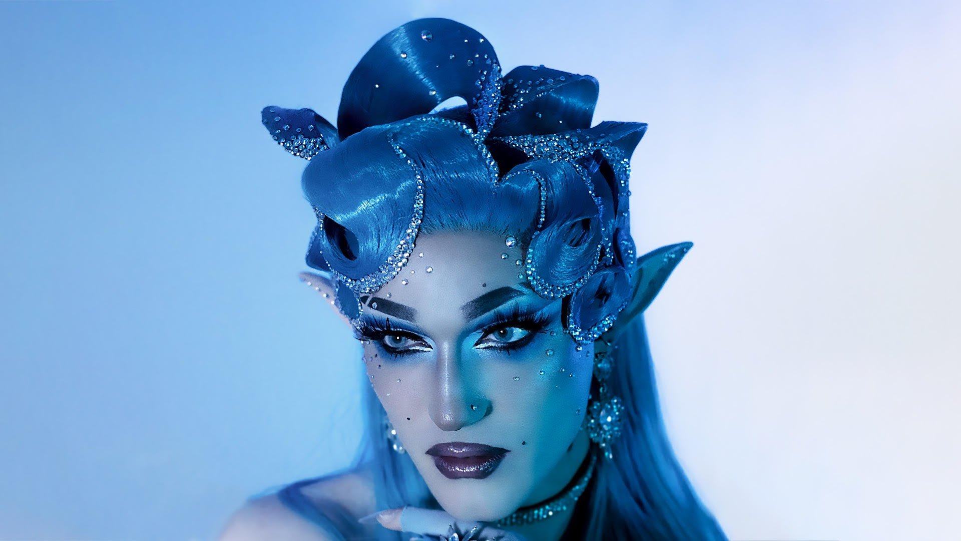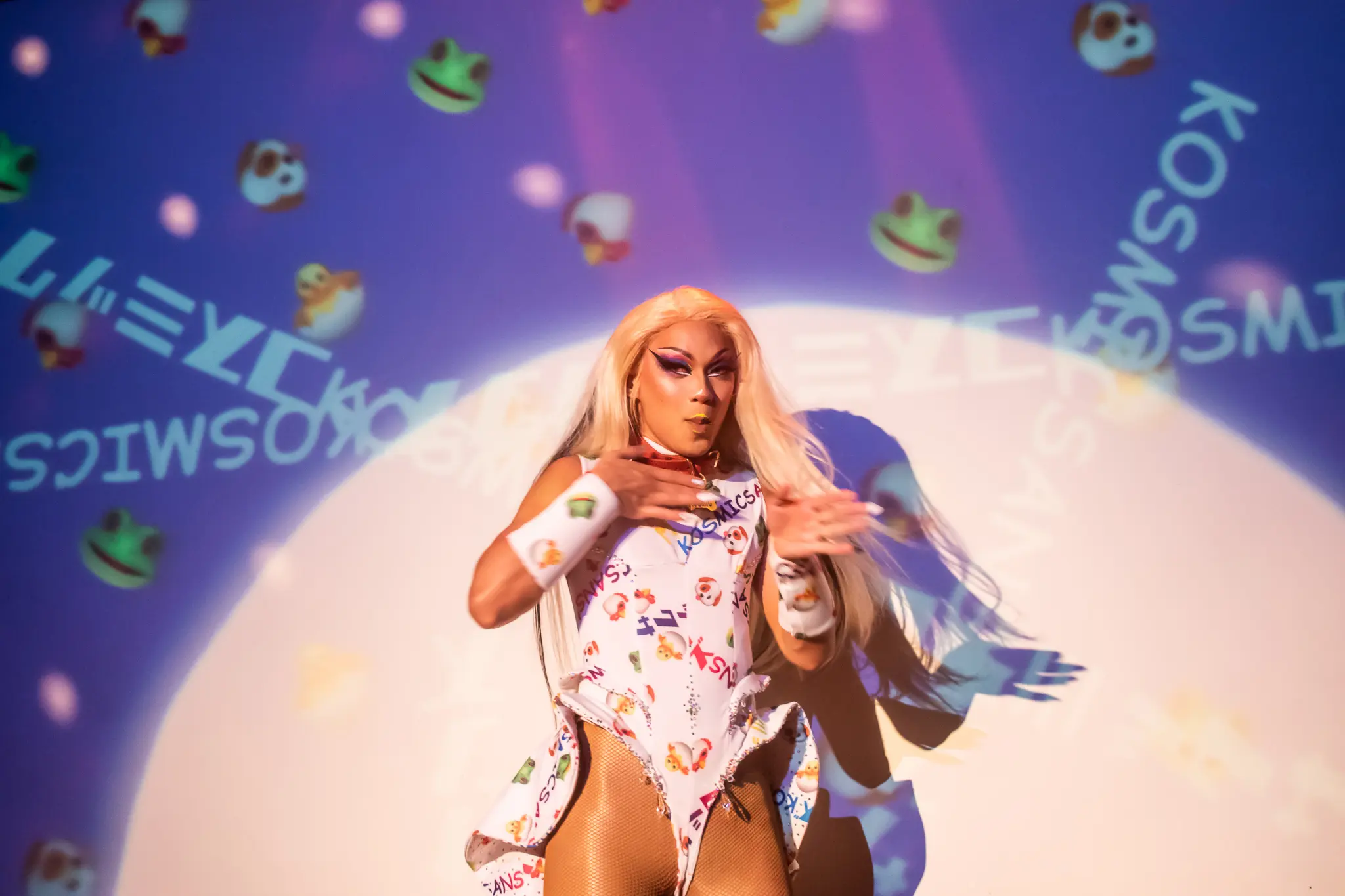 Kosmic Sans is a drag queen famous for her highly detailed drag shows, often bringing in multiple dimensions and media elements into her performances, such as background visualizers, LED light reveals and UV-reactive makeup. For other queens, Kosmic offers custom press-on nail art and graphic design for videos and visualizers — all her specialties.