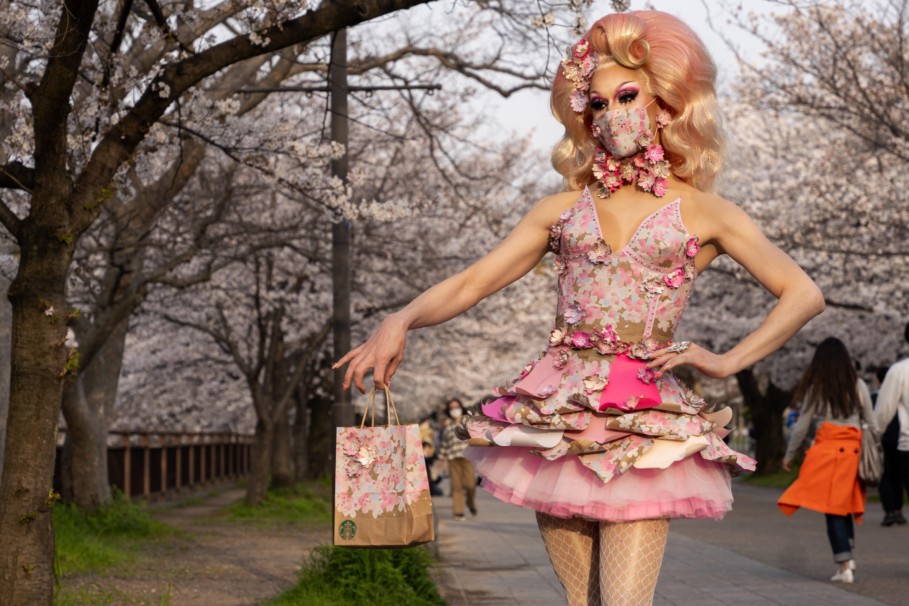 Supporting drag performers in the Kansai area, Osaka-based Velma Joan Belle is a do-it-yourself queen, from her wig to her dresses. Most recently, Belle created a sensation online when she put out a video about crafting her own gown and hair accessories from recycled Starbucks bags.