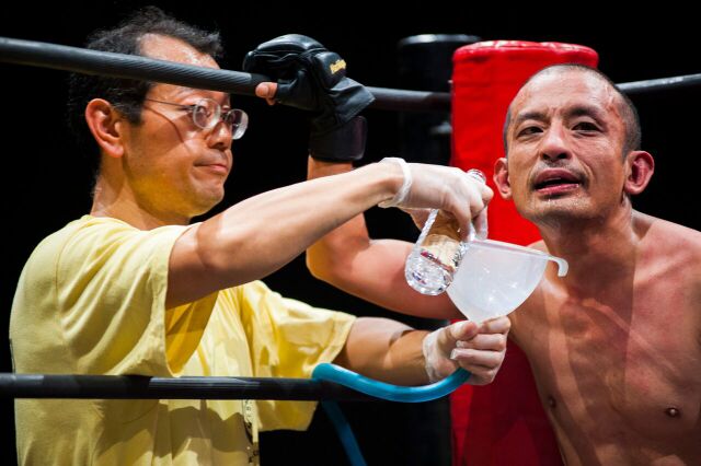 Doglegs co-founder, and star of the film, Shintaro Yano (ring name “Sambo” Shintaro) catches his breath between bouts. Credit: Alfie Goodrich